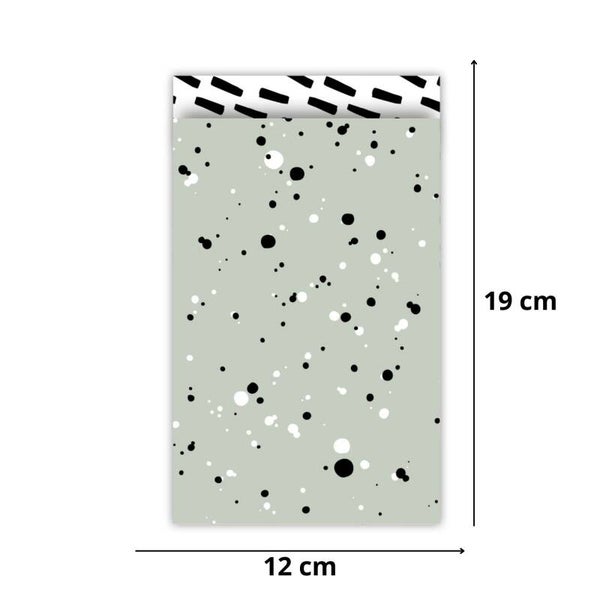 Leuke, stevige groene inpakzakjes met gezellige stippen. De binnenzijde van de zakjes is wit met zwarte stepen.