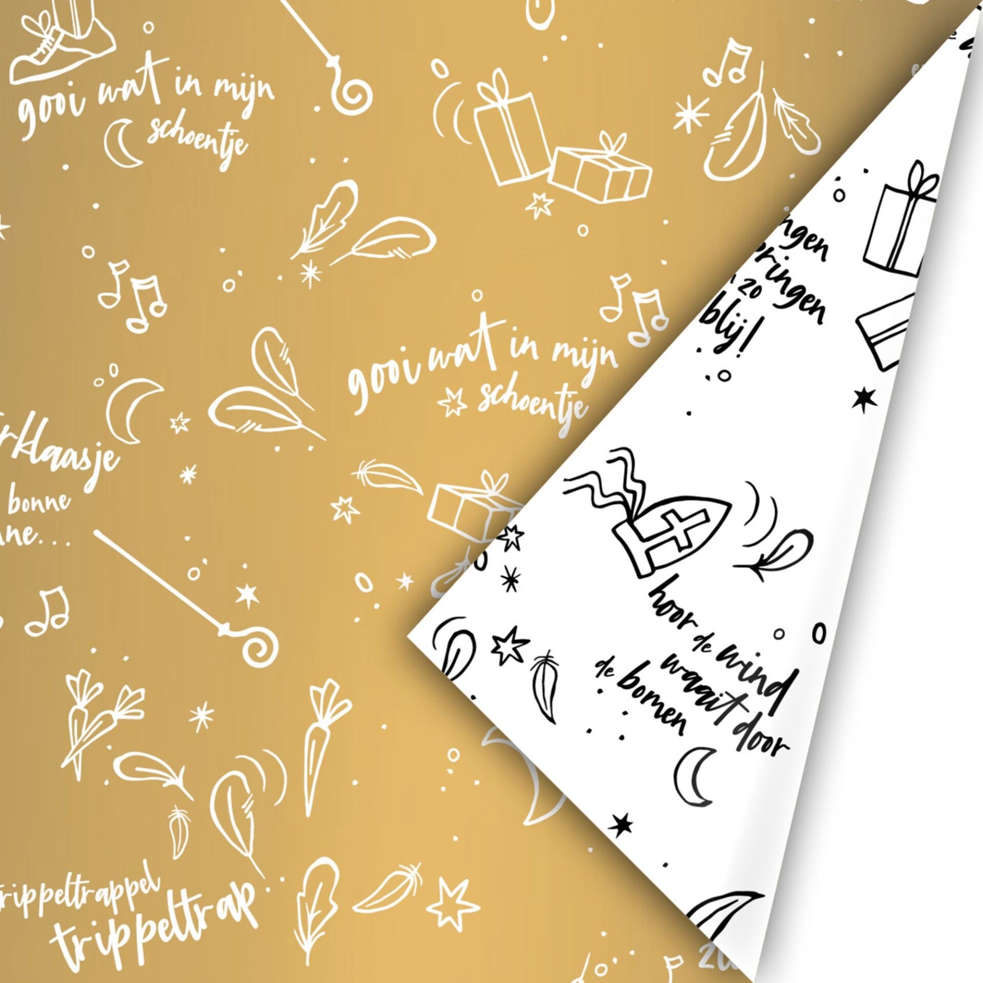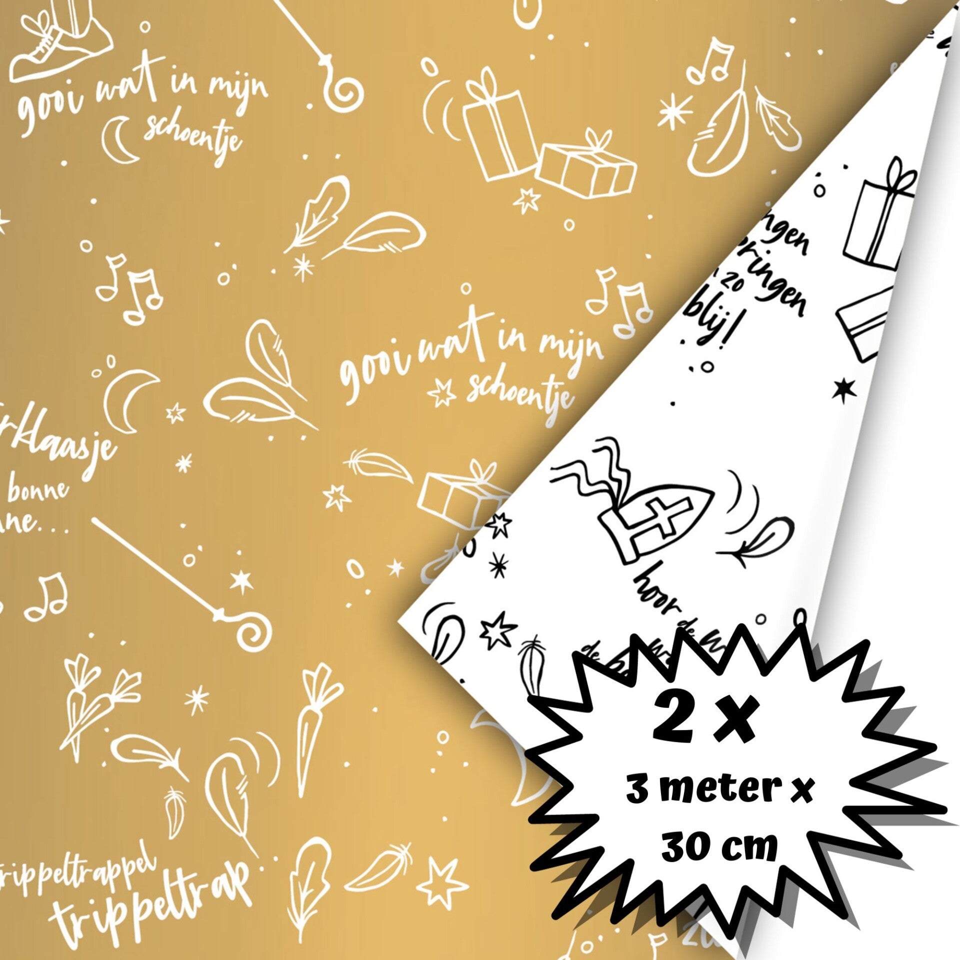 🖤 2 rollen Sinterklaas dubbelzijdig cadeaupapier | 3 meter x 30 centimeter per rol | Goud Zwart Wit