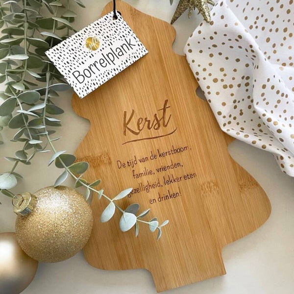 Maak de tafel voor het kerstdiner helemaal af met deze borrelplank in de vorm van een kerstboom! Op de plank staat de tekst: "de tijd van de kerstboom, familie, vrienden, gezelligheid, lekker eten en drinken!