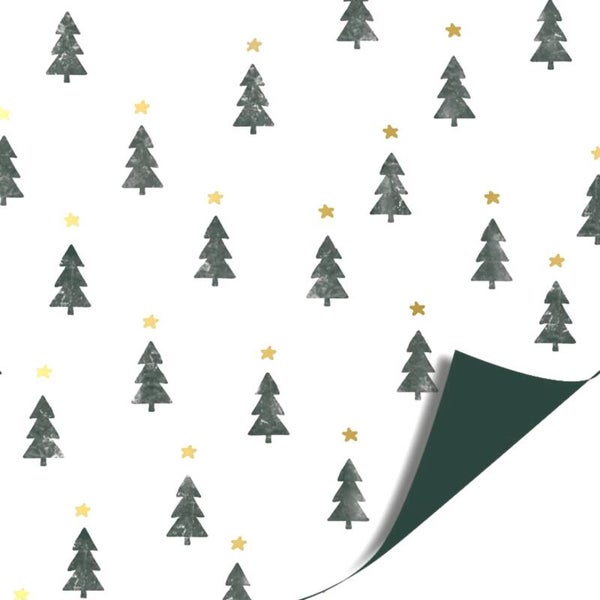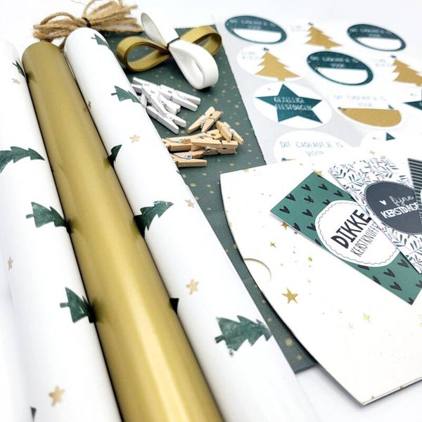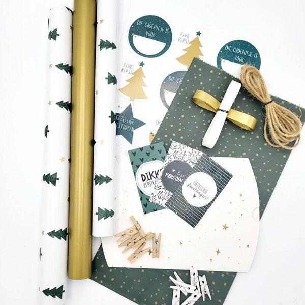 2 rollen dubbelzijdig goud cadeaupapier met kerstbomen (groen), 1 prachtige rol glanzend goud inpakpapier, 1 grote blokbodemcadeauzak, cadeaulint, jute touw een stickervel met 12 stickers, 3 cadeaulabels en 12 houten knijpertjes.