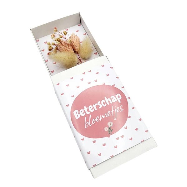 Dit cadeautje bestaat uit een schuifdoosje gevuld met kleine droogbloemen. Op de wikkel van het doosje staat de tekst 'Beterschap bloemetjes' en in het doosje staat nog de tekst 'Veel beterschap'.