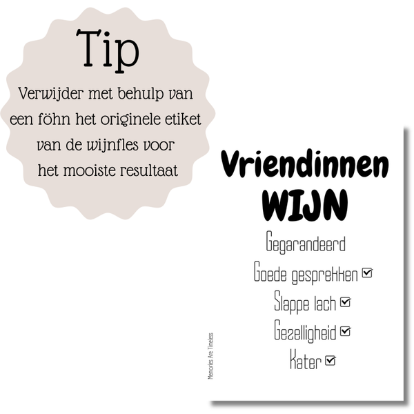 ✨ Tip: Wil je liever meteen een compleet cadeau geven? Kies dan voor onze Vriendinnen wijn cadeau variant – hierbij ontvang je een fles wijn (wit, rosé of rood) met jouw gekozen etiket al mooi op de fles geplakt. Superleuk om direct te versturen!