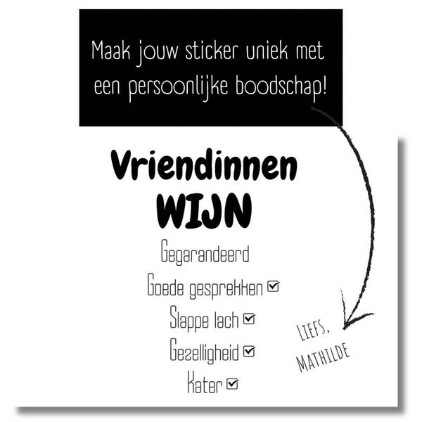 Er gaat niets boven een gezellig avondje samen met vriendinnen kletsen, wijntjes drinken en vooraf weten dat je de dag erna een kater hebt ;). Met dit wijnetiket maak je zelf een heerlijke fles Vriendinnen Wijn. Kies voor een standaard afmeting of geef ons de maten door die jouw sticker moet hebben. Zo zit je altijd goed! En hoe leuk....er is zelfs een optie om de sticker te personaliseren! Kies je voor deze optie dan mag je ons doorgeven wat er als extra boodschap op de sticker gedrukt mag worden!