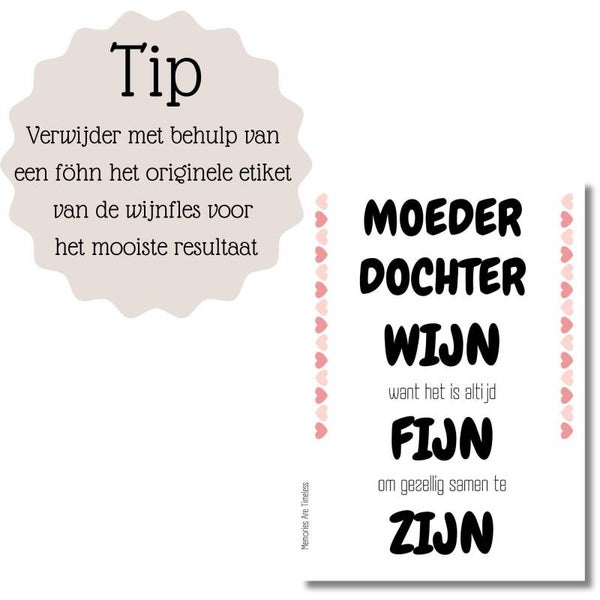 ✨ Tip: Wil je liever meteen een compleet cadeau geven? Kies dan voor onze Moeder Dochter wijn cadeau variant – hierbij ontvang je een fles wijn (wit, rosé of rood) met jouw gekozen etiket al mooi op de fles geplakt. Superleuk om direct te versturen!