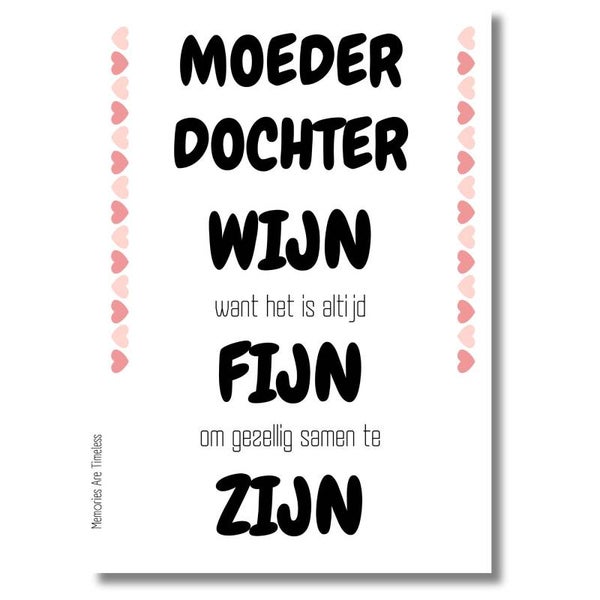 Gezellig samen, moeder en dochter, genietend van een glas (of fles ;) heerlijk wijn. Samen kletsen of gewoon juist niets zeggen en dat glas steeds bijvullen :) Met dit wijnetiket maak je jullie eigen moeder dochter wijn, garantie voor een mooie avond!