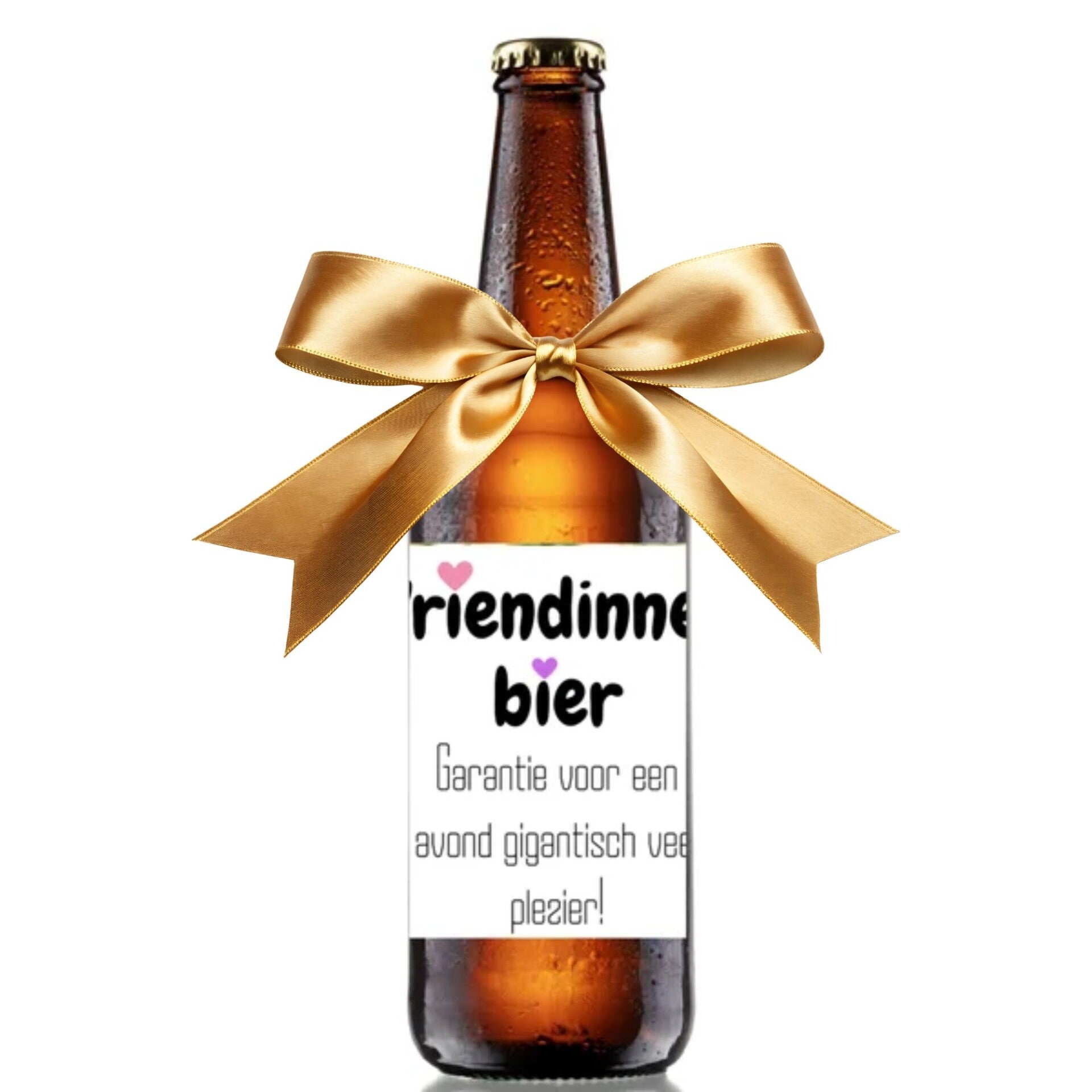 Op het flesje zit een vrolijk etiket met de tekst: “Vriendinnen Bier – Garantie voor een avond gigantisch veel plezier!”. Voor een kleine meerprijs is het ook mogelijk om het etiket te personaliseren met je eigen tekst, zodat het cadeau helemaal uniek wordt.