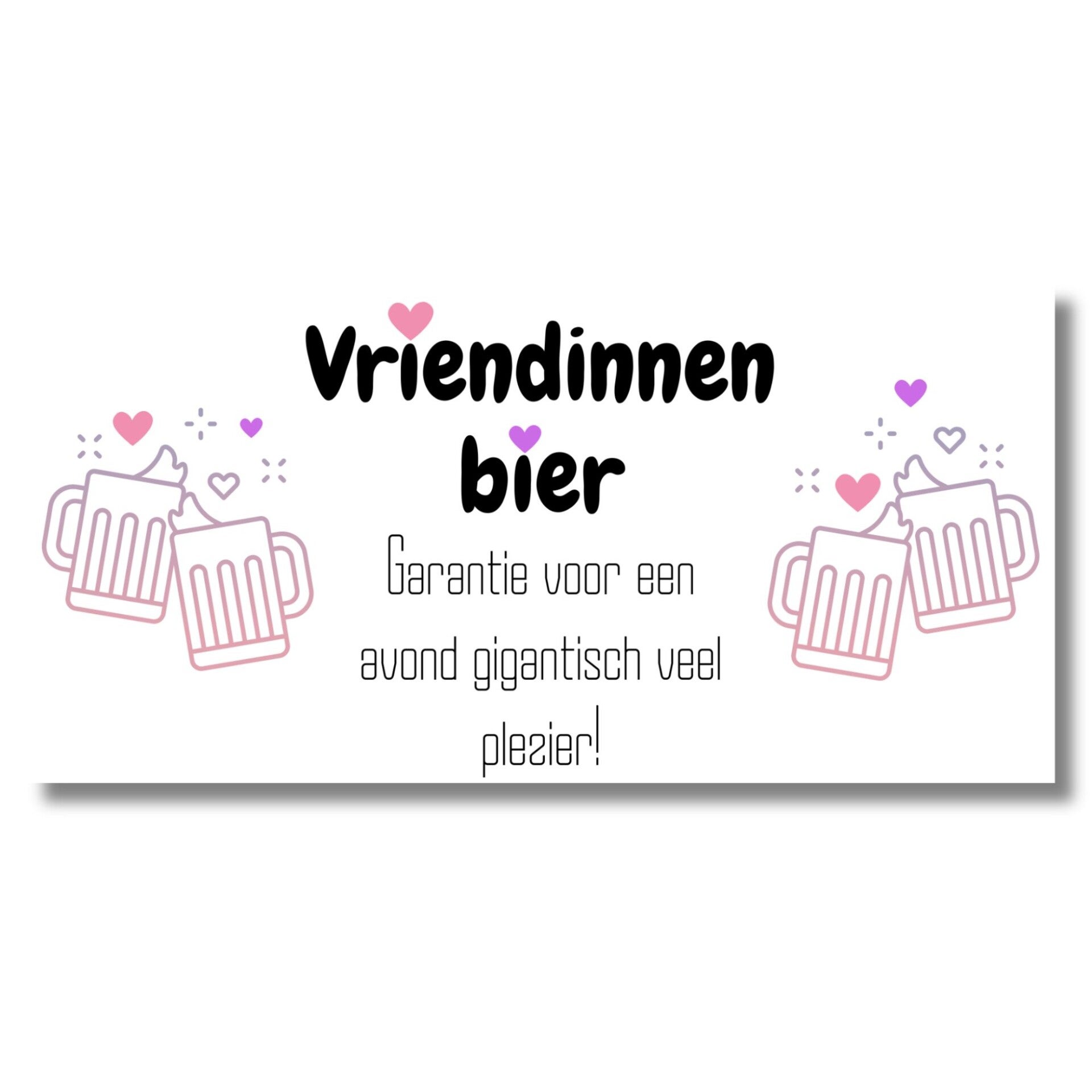 Etiket met de tekst: “Vriendinnen Bier – Garantie voor een avond gigantisch veel plezier!”