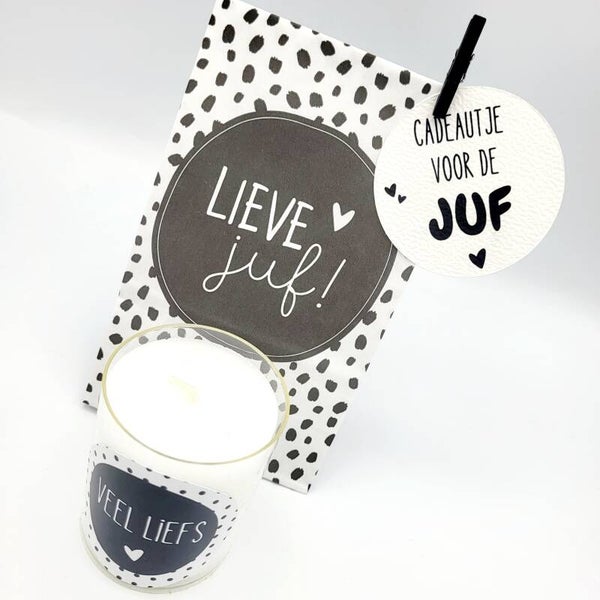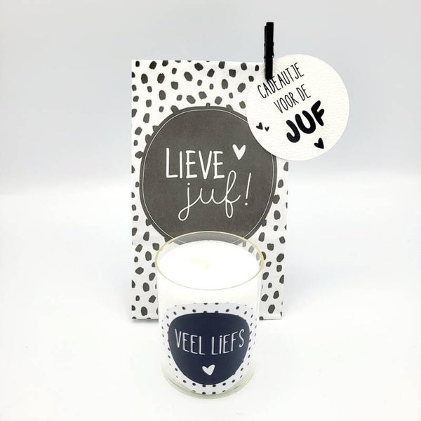 Bedank de juf met deze charmante cadeauset: een kaars met de tekst “Veel Liefs” in een stevig cadeauzakje met de tekst “Lieve Juf”.