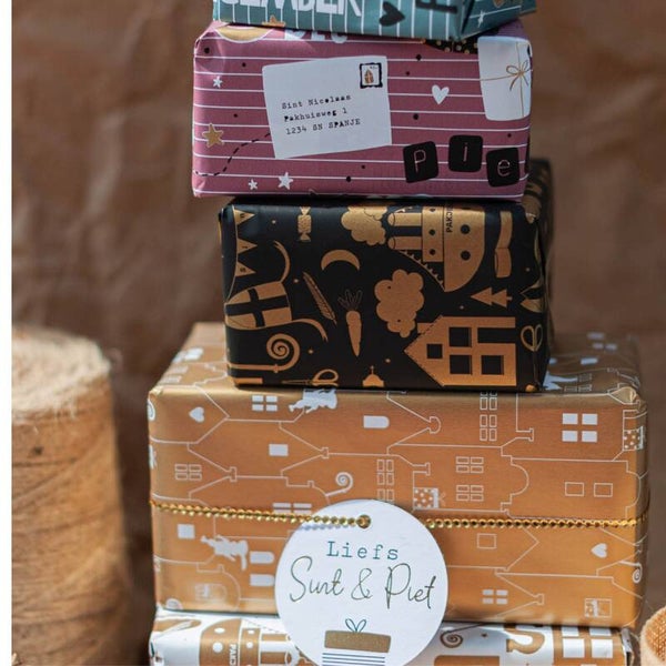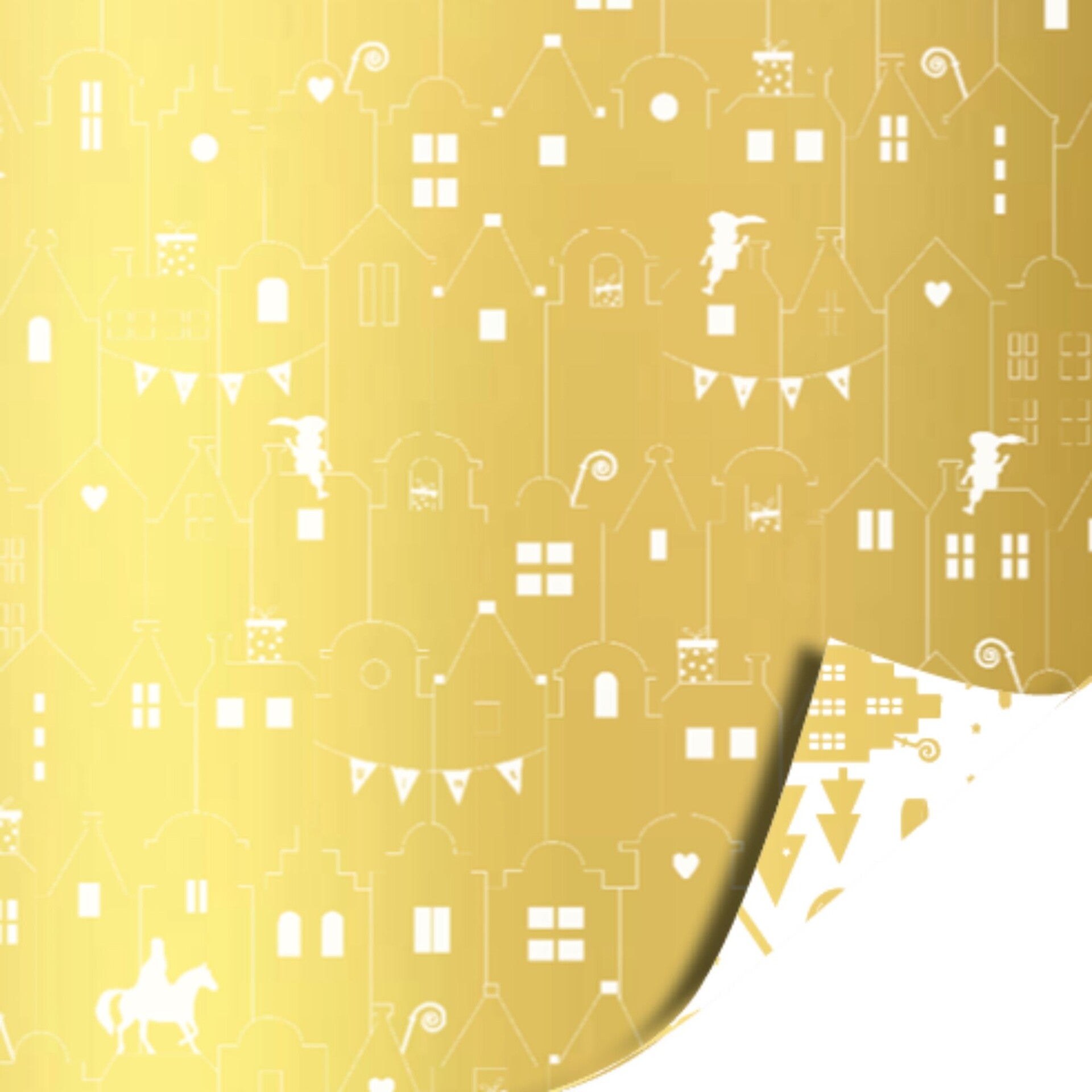 Draai het papier om en je ontdekt de andere kant, die schittert in een luxe gouden kleur met een betoverend tafereel van daken van huizen. Hierop zie je de pieten druk in de weer en Sinterklaas die op zijn paard rijdt.