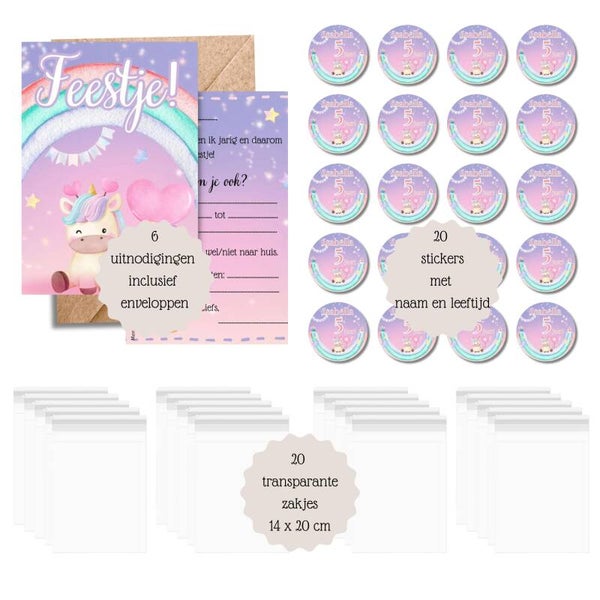 Alles wat je nodig hebt voor de perfecte uitnodigingen en traktaties in één handige set. Met een magisch unicorn thema creëer je een feest dat kinderen en ouders zich nog lang zullen herinneren. Deze set combineert stijl, gemak en een persoonlijke touch voor een sprankelende verjaardag!