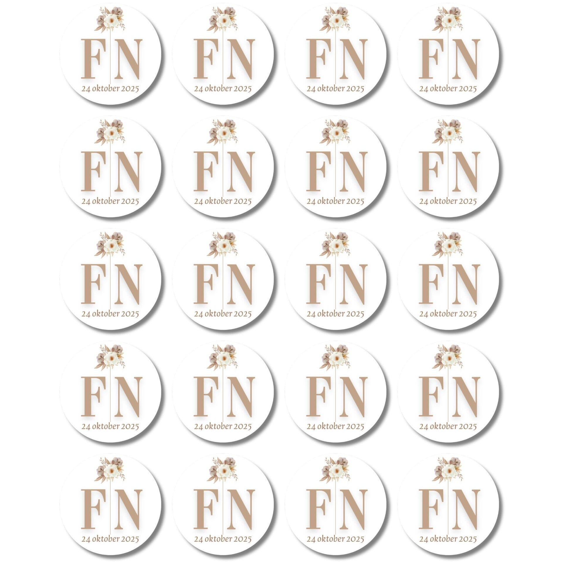 De stickers hebben een omvang van 4 cm en een vel bestaat uit 20 stickers. Naast jullie initialen is er ook ruimte voor het plaatsen van de trouwdatum op de sticker.