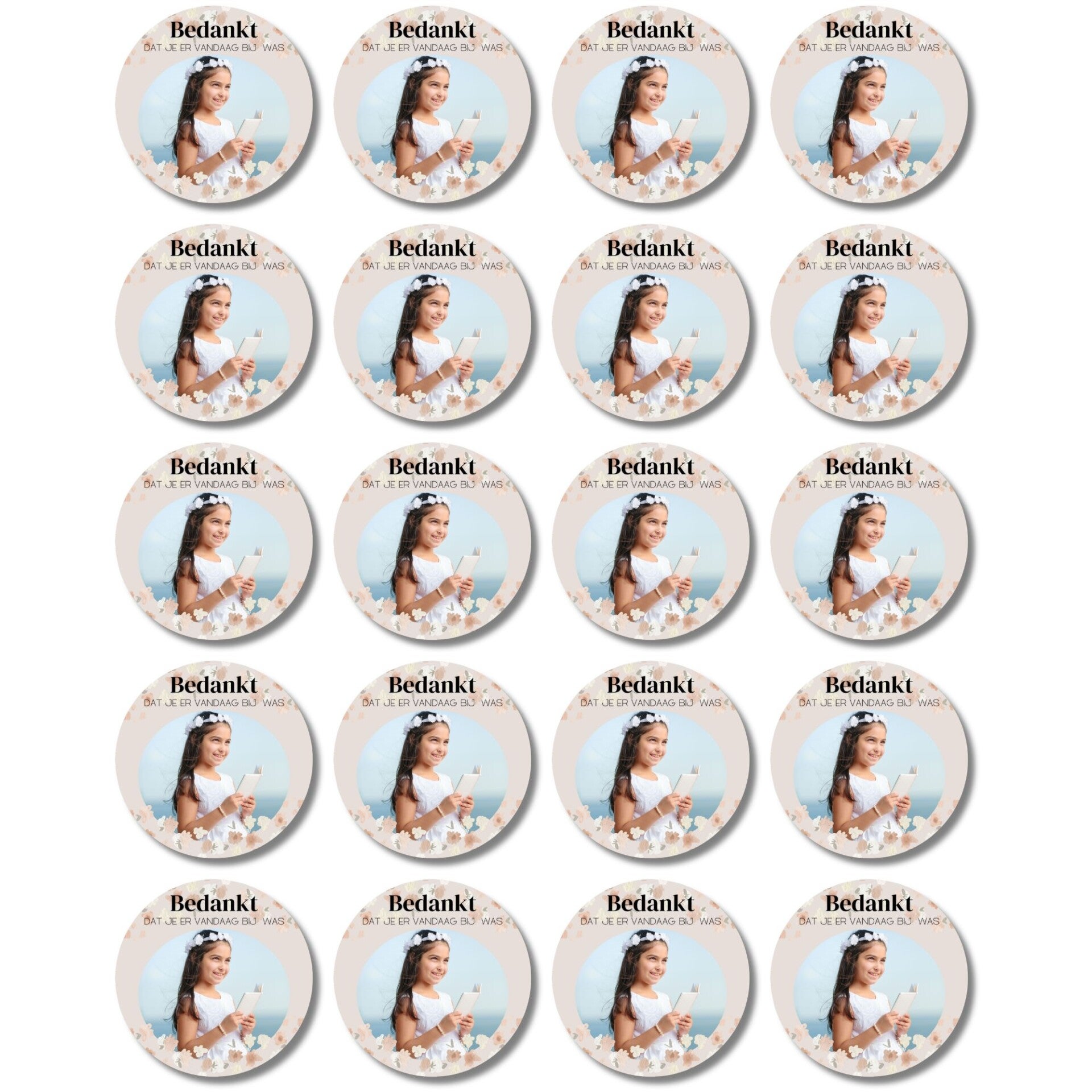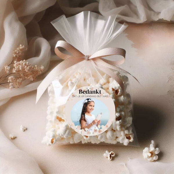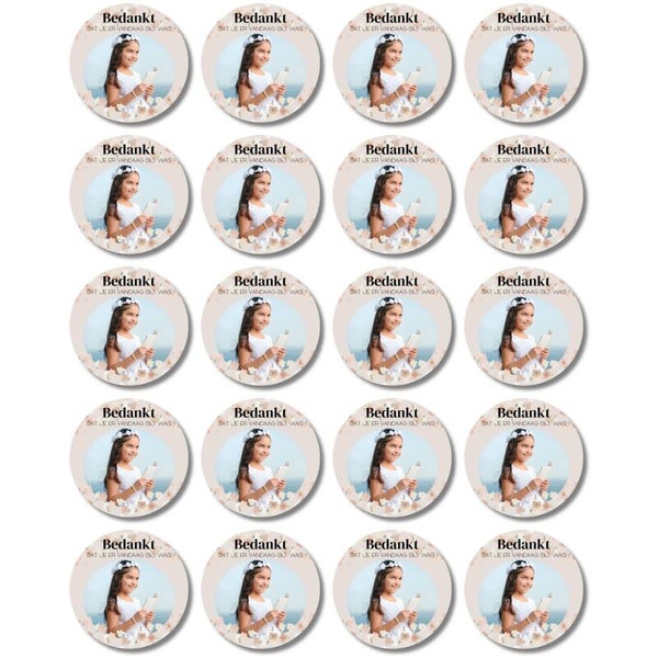 Maak je bedankjes voor de 1e Heilige Communie extra persoonlijk met onze mooie stickers! Deze stickers zijn te personaliseren met een foto en de tekst "Bedankt dat je er vandaag bij was". Ze zijn perfect voor het versieren van kleine bedankjes, zoals snoepjes, zakjes of andere cadeautjes die je aan je gasten wilt geven.