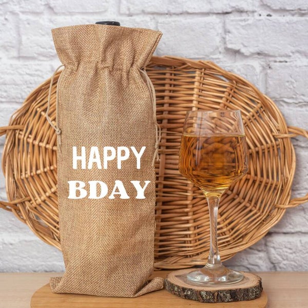 Combineer één van onze wijnetiketten met deze leuke wijntas en maak de verjaardag van een vriend, familielid of collega extra bijzonder met deze stijlvolle wijntas van jute! De tas is eenvoudig maar elegant en heeft de tekst "Happy Bday" in frisse witte letters bedrukt. Perfect om een fles wijn cadeau te geven op een feestelijke gelegenheid!