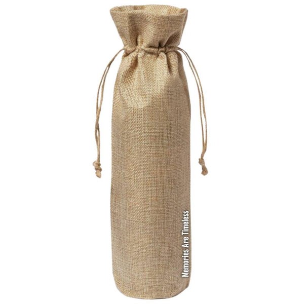 De tas is gemaakt van stevig jute, wat niet alleen een mooie, natuurlijke uitstraling heeft, maar ook duurzaam en praktisch is voor het dragen van een fles wijn.