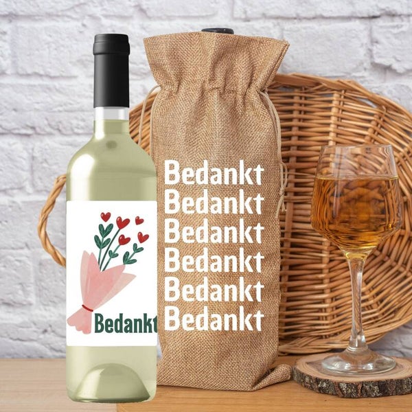 - Materiaal wijntas: Jute met de tekst “Bedankt (x6)”.