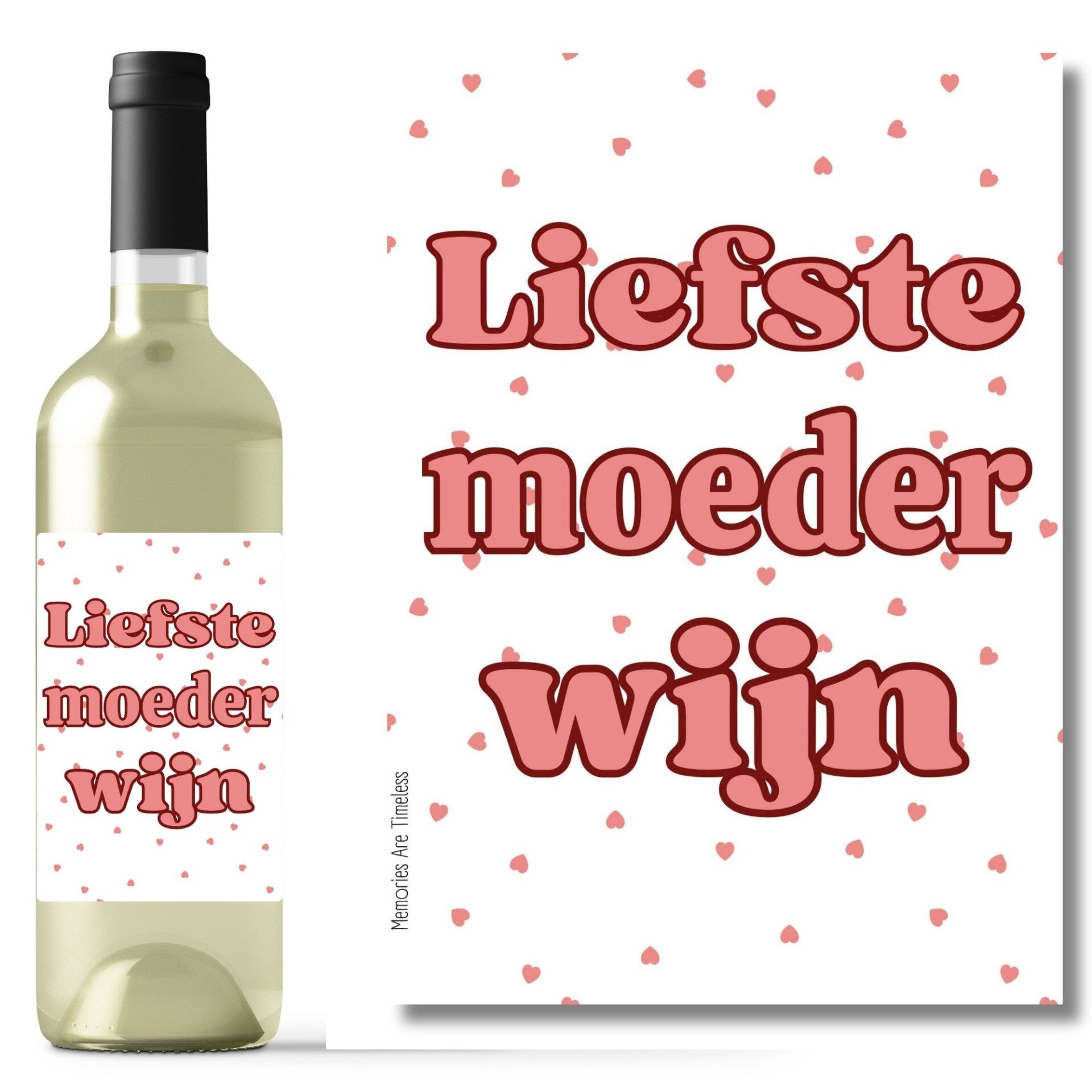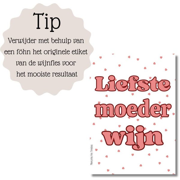 ✨ Tip: Wil je liever meteen een compleet cadeau geven? Kies dan voor onze Liefste Moeder wijn cadeau variant – hierbij ontvang je een fles wijn (wit, rosé of rood) met jouw gekozen etiket al mooi op de fles geplakt. Superleuk om direct te versturen!