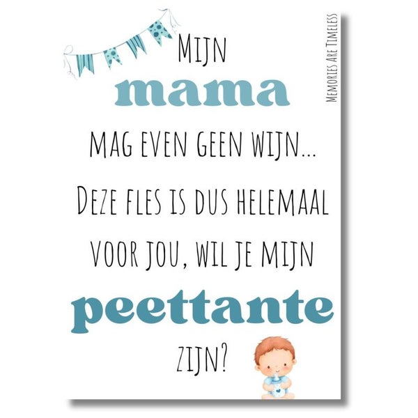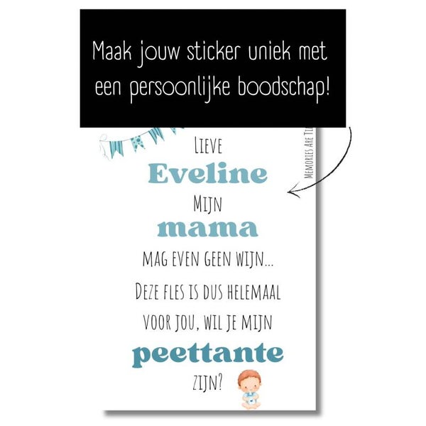 Maak het vragen van de peettante op een unieke en hartverwarmende manier extra speciaal met dit originele wijnflesetiket! Op het etiket staat de lieve tekst: "Mijn mama mag even geen wijn... deze fles is dus helemaal voor jou. Wil je mijn peettante zijn?" – een creatieve en ontroerende manier om iemand te vragen een bijzondere rol te vervullen.