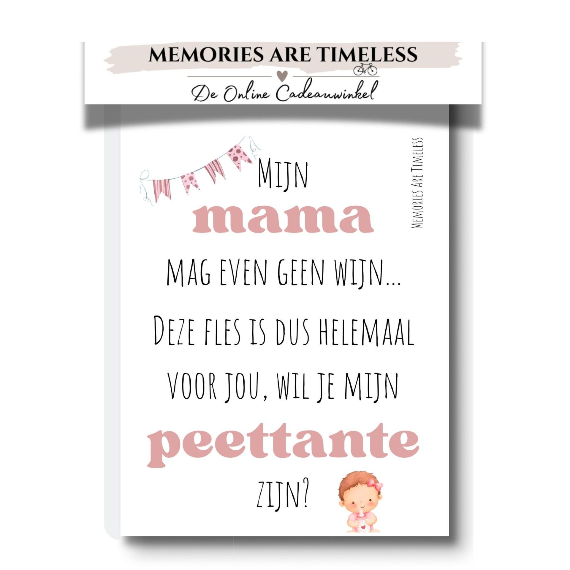 Verras de toekomstige peettante met een unieke en liefdevolle vraag verpakt in een wijnfles met origineel etiket! Op het etiket staat de hartverwarmende tekst: "Mijn mama mag even geen wijn... deze fles is dus helemaal voor jou. Wil je mijn peettante zijn?" – een ontroerende en creatieve manier om iemand te vragen een belangrijke rol in jullie leven te spelen.