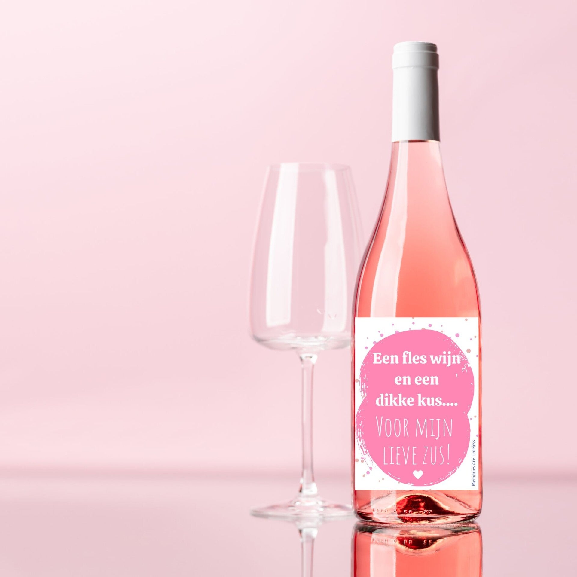 Op zoek naar een lief en origineel cadeautje voor je zus? Dit witte wijnetiket met roze accenten en de hartverwarmende tekst "Een fles wijn en een dikke kus voor mijn lieve zus" maakt van een gewone fles wijn een persoonlijk en betekenisvol gebaar.