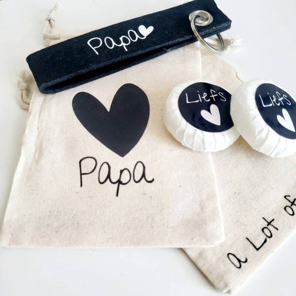 In het zakje zitten twee heerlijk geurende zeepjes met de opdruk "Liefs" en een hartje – een subtiele en liefdevolle verrassing. Ook bevat het een stevige sleutelhanger met de tekst "Papa" en een hartje. Een blijvend aandenken voor dagelijks gebruik.
