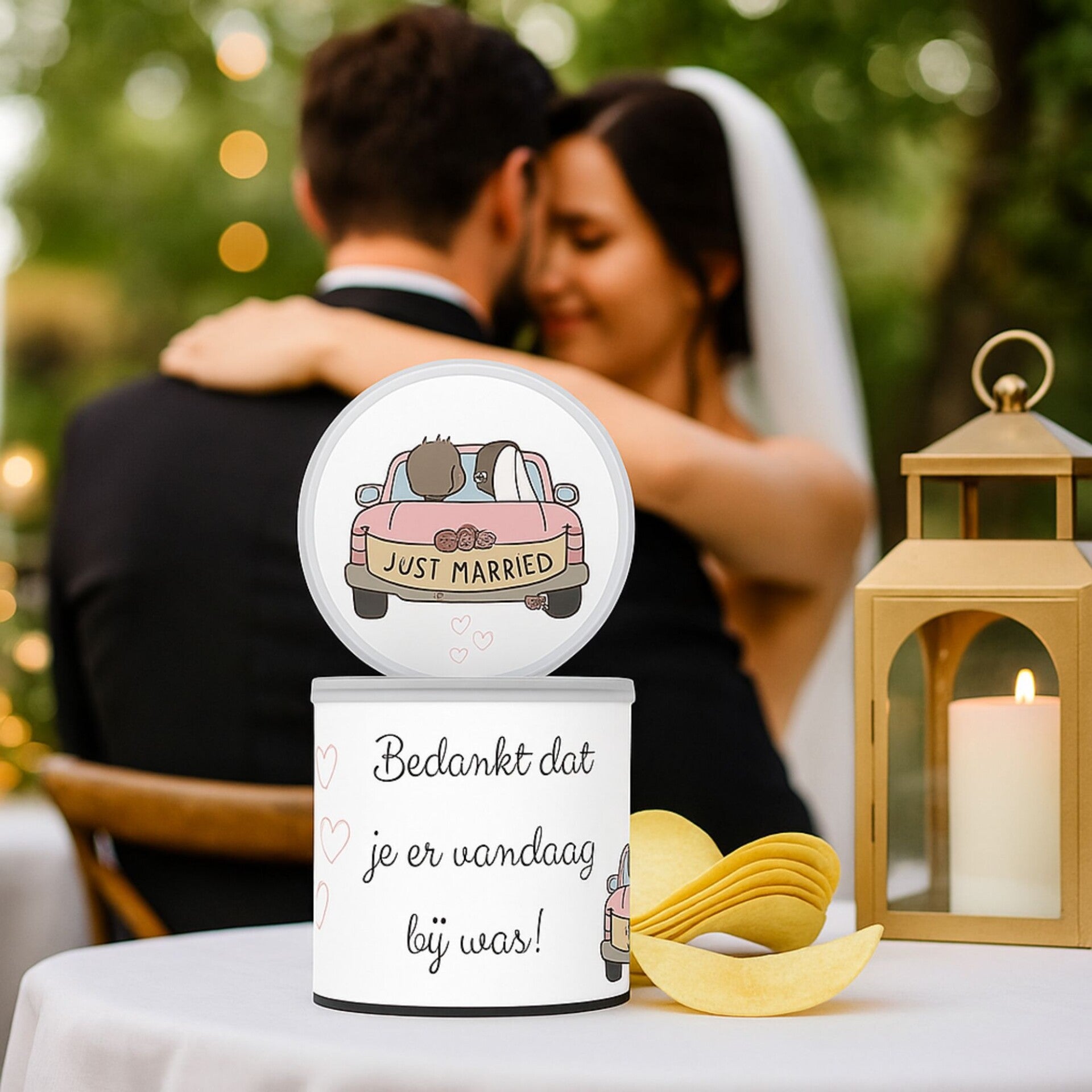 Printable Pringles traktatie – Just Married | Bruiloft bedankje om zelf te printen