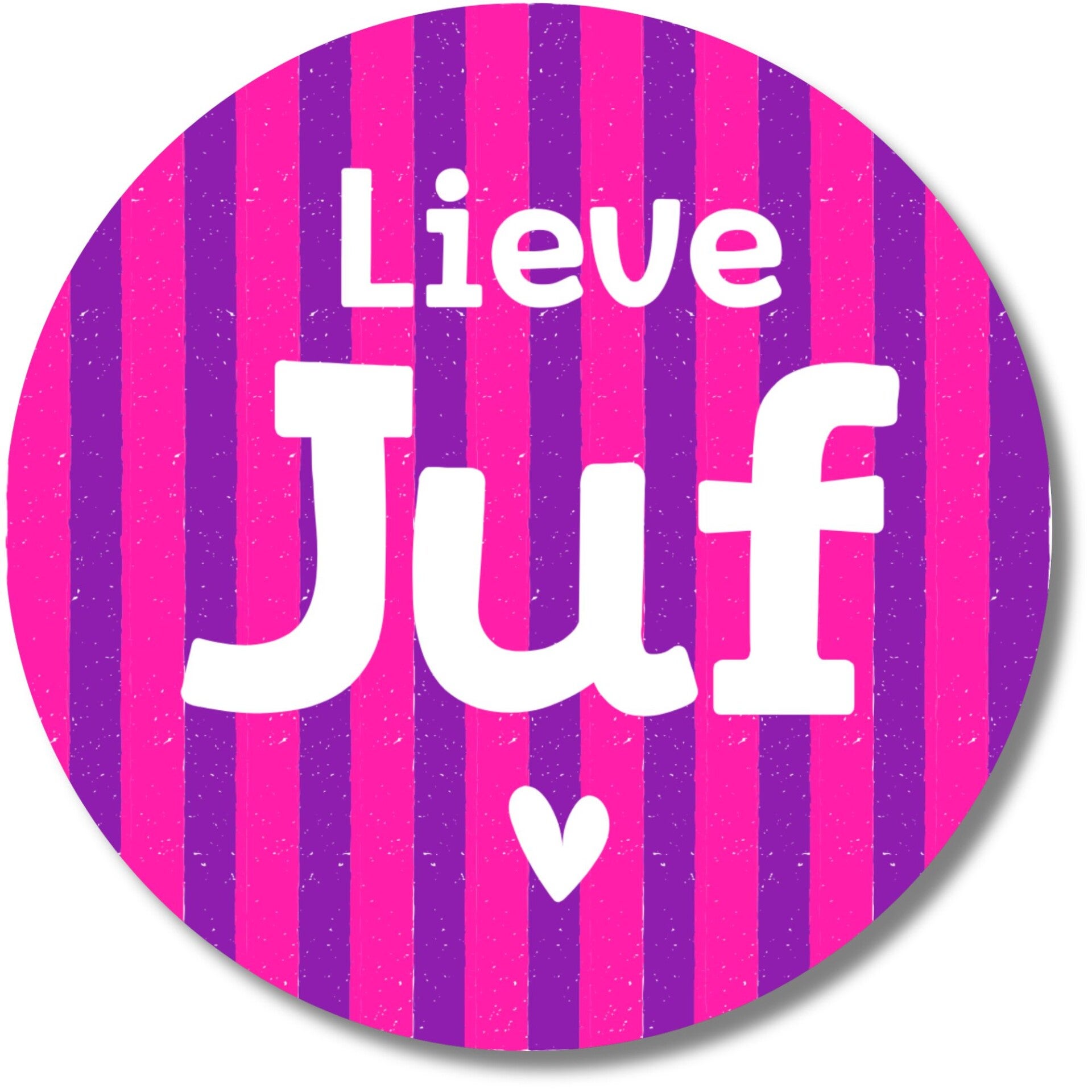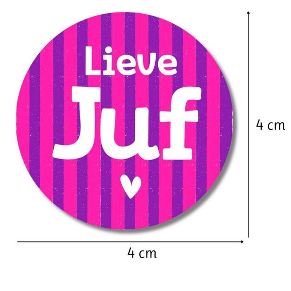 Deze vrolijke stickers met de tekst “Lieve Juf” zijn perfect als bedankje aan het einde van het schooljaar. Plak ze op een cadeautje, kaart of traktatie om de juf op een lieve manier te verrassen.