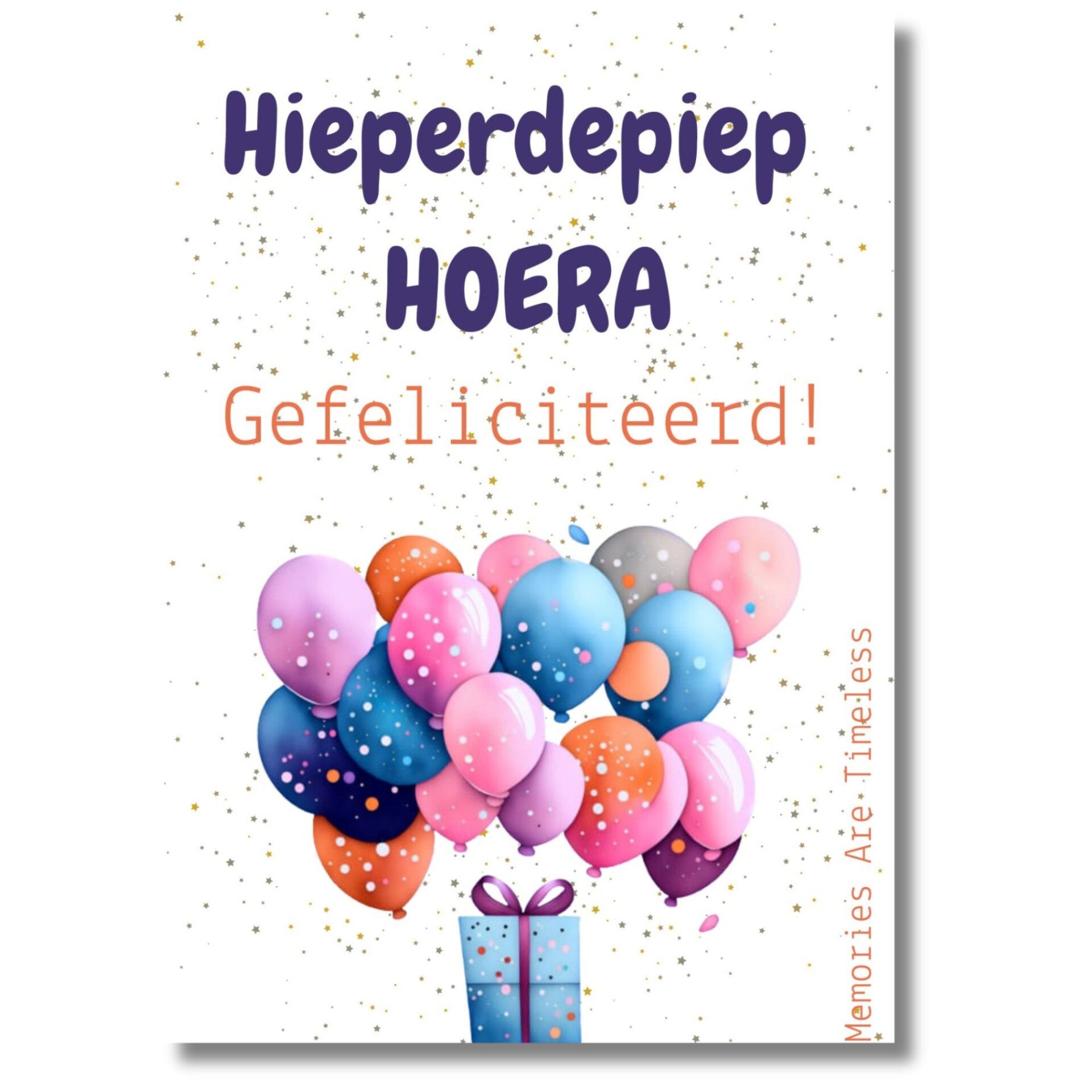 Vier een verjaardag in stijl met dit feestelijke wijnetiket! Met vrolijke ballonnen, gouden sterretjes en de tekst “Hieperdepiep Hoera – Gefeliciteerd!” maakt dit etiket van iedere fles wijn een feestelijk en origineel cadeau. Perfect voor jong en oud, en geschikt voor allerlei gelegenheden.