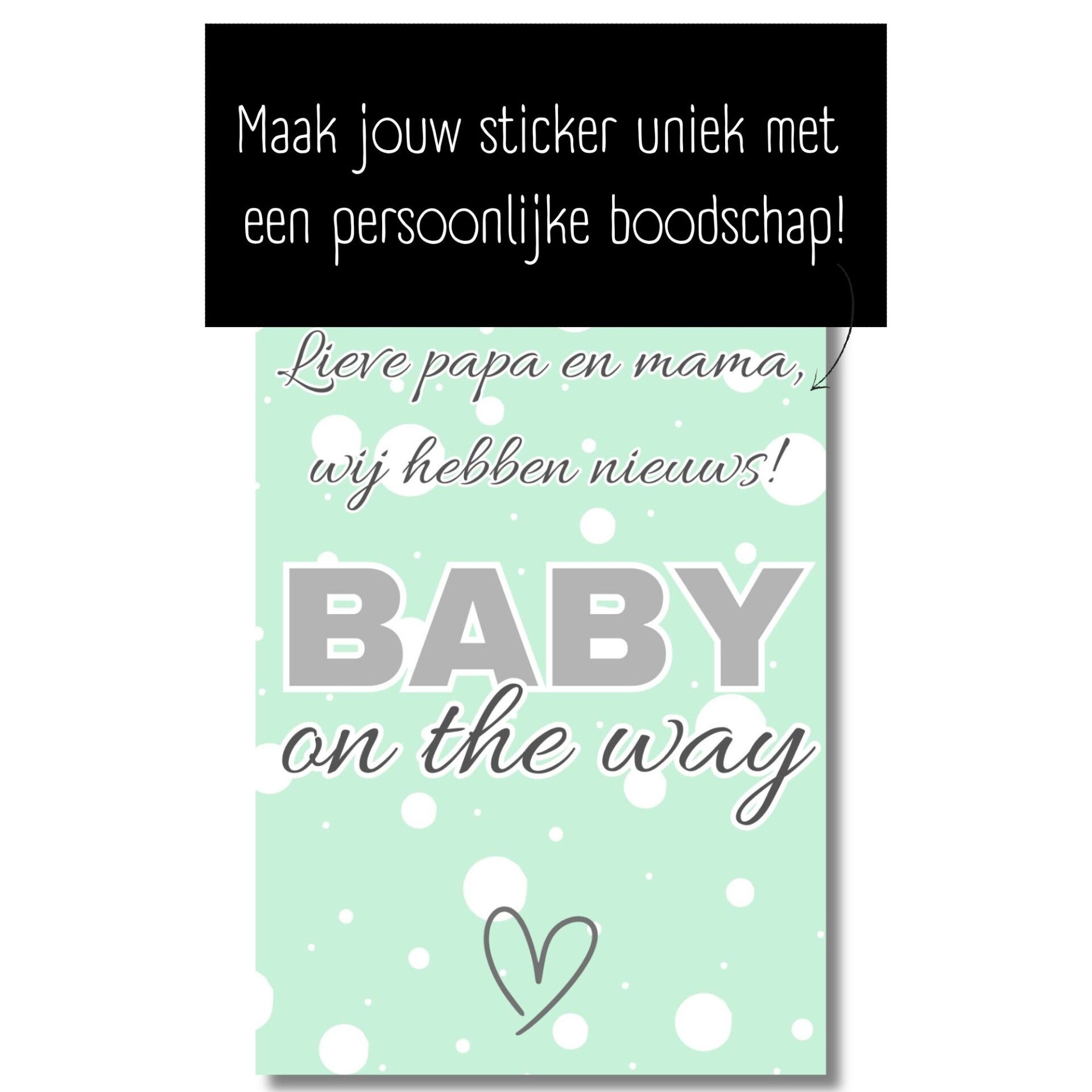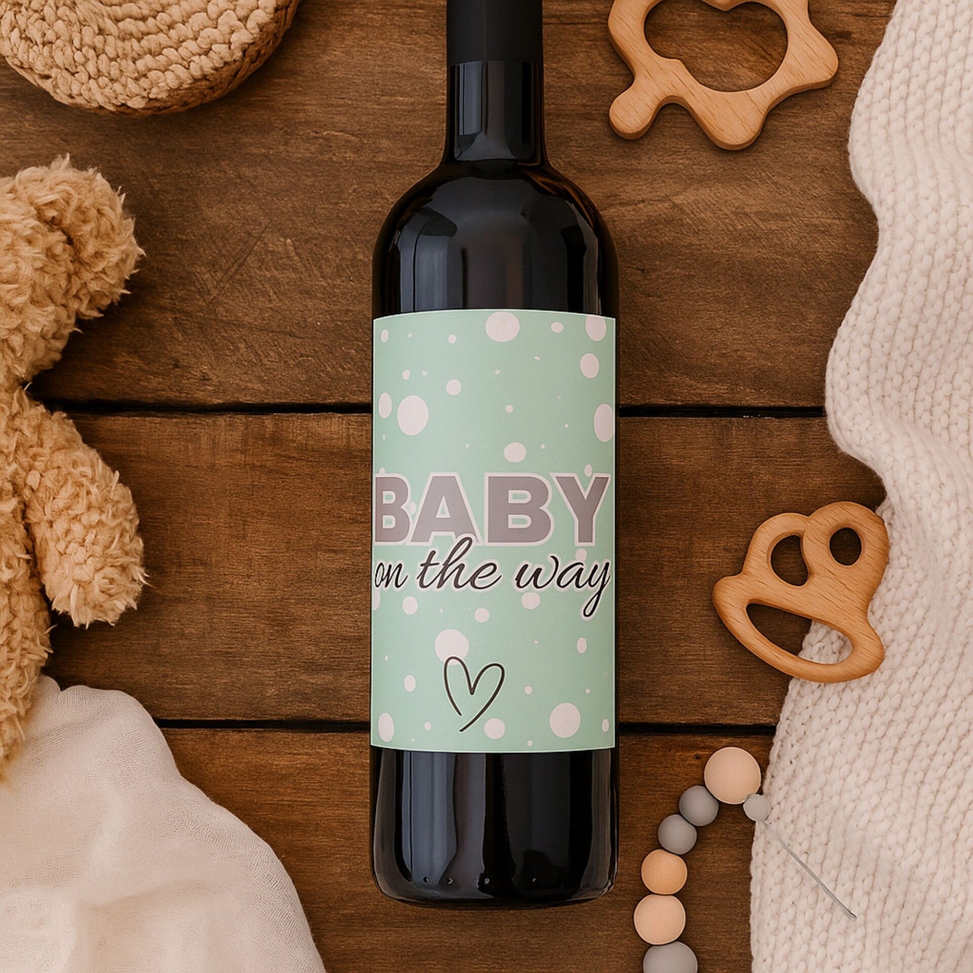 Verras vrienden en familie met een originele zwangerschapsaankondiging met dit stijlvolle wijnetiket! Met de tekst “Baby on the way” in zachte mintgroene tinten met witte stippen en een lief hartje, maak je van een fles wijn een bijzondere en blijvende herinnering aan dit speciale moment.