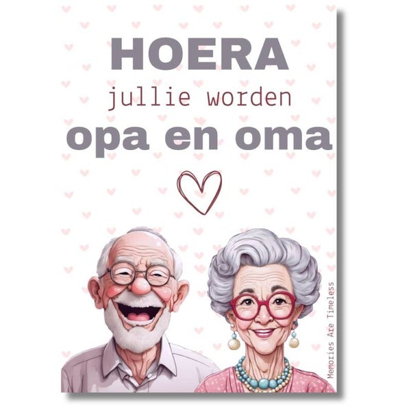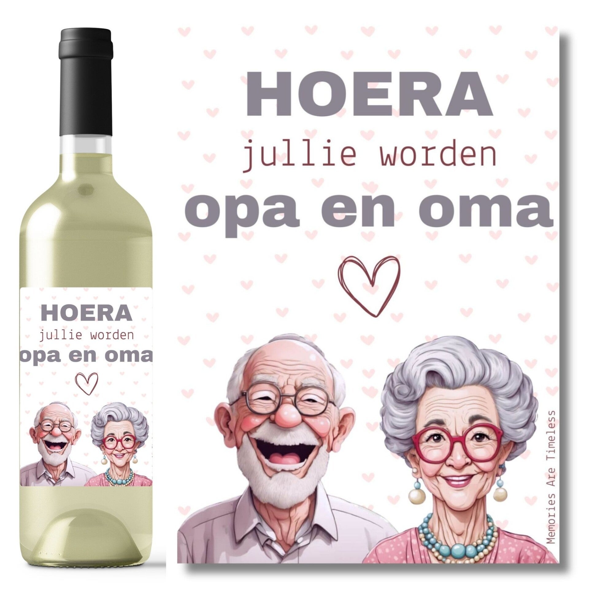 Verras toekomstige opa en oma met een originele zwangerschapsaankondiging! Dit vrolijke wijnetiket met de tekst “Hoera, jullie worden opa en oma”, een schattige illustratie van opa en oma en een achtergrond vol hartjes maakt van een fles wijn een onvergetelijk cadeau.