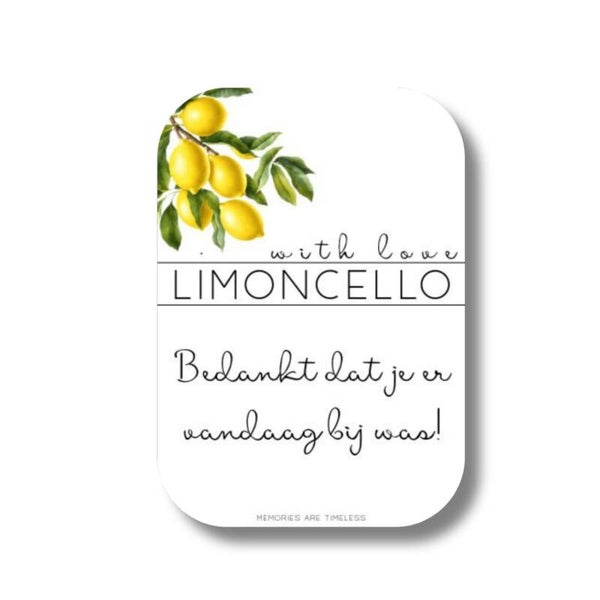Maak jouw feest of bijzondere gelegenheid extra stijlvol met deze prachtige Limoncello etiketten. Op elk etiket staat de tekst: “With love Limoncello – Bedankt dat je er vandaag bij was!”. Perfect om kleine flesjes Limoncello een persoonlijke en luxe uitstraling te geven.