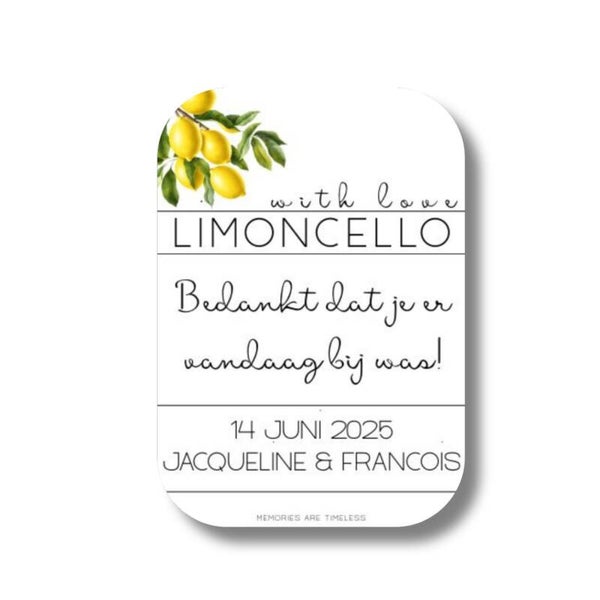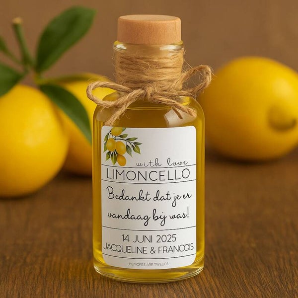 Geef jouw gasten een uniek aandenken met deze stijlvolle etiketten voor mini flesjes Limoncello. De etiketten zijn 3 x 4 cm groot en passen perfect op kleine flesjes van 50 ml. Dankzij de gepersonaliseerde tekst – zoals naam, datum of korte boodschap – maak je ieder flesje bijzonder.