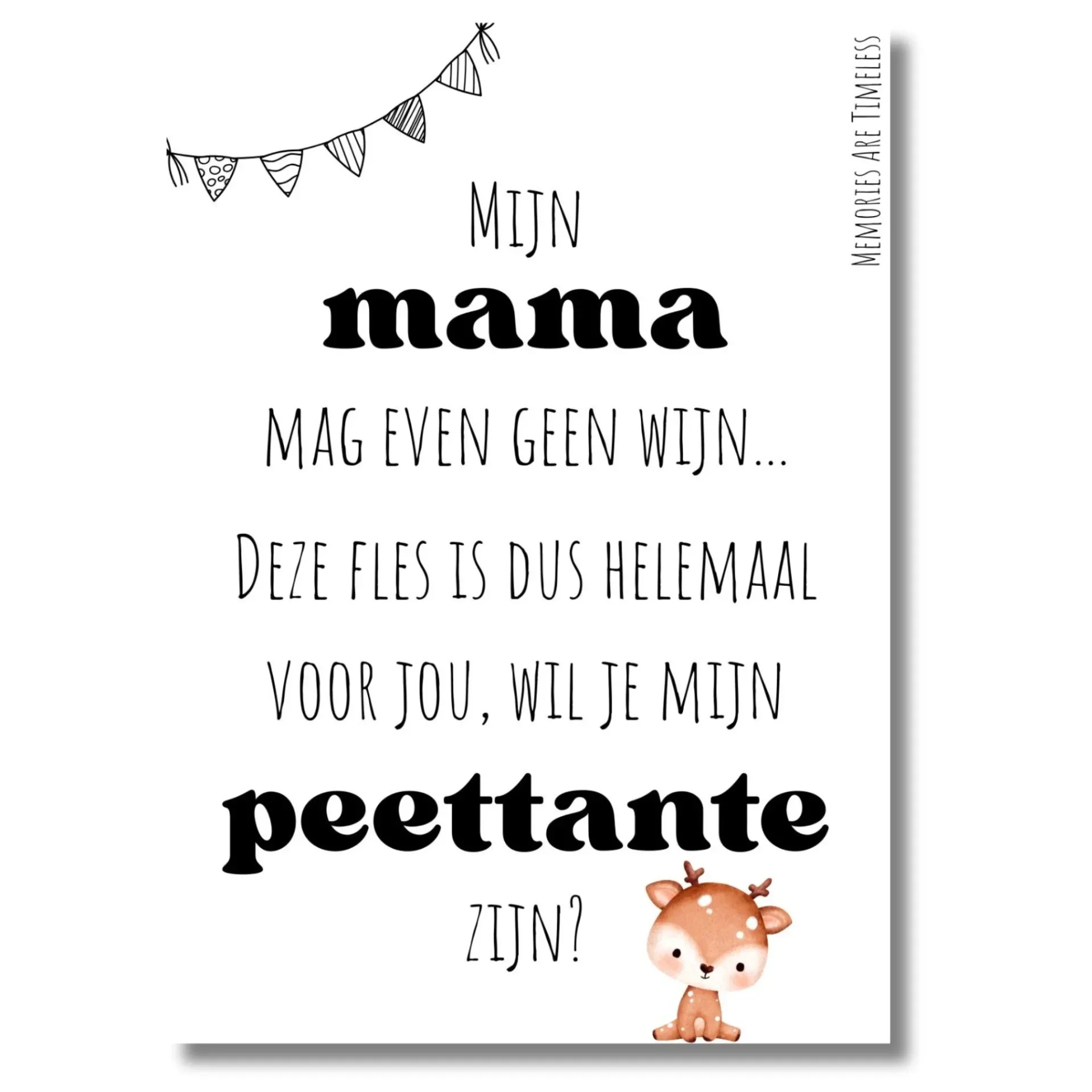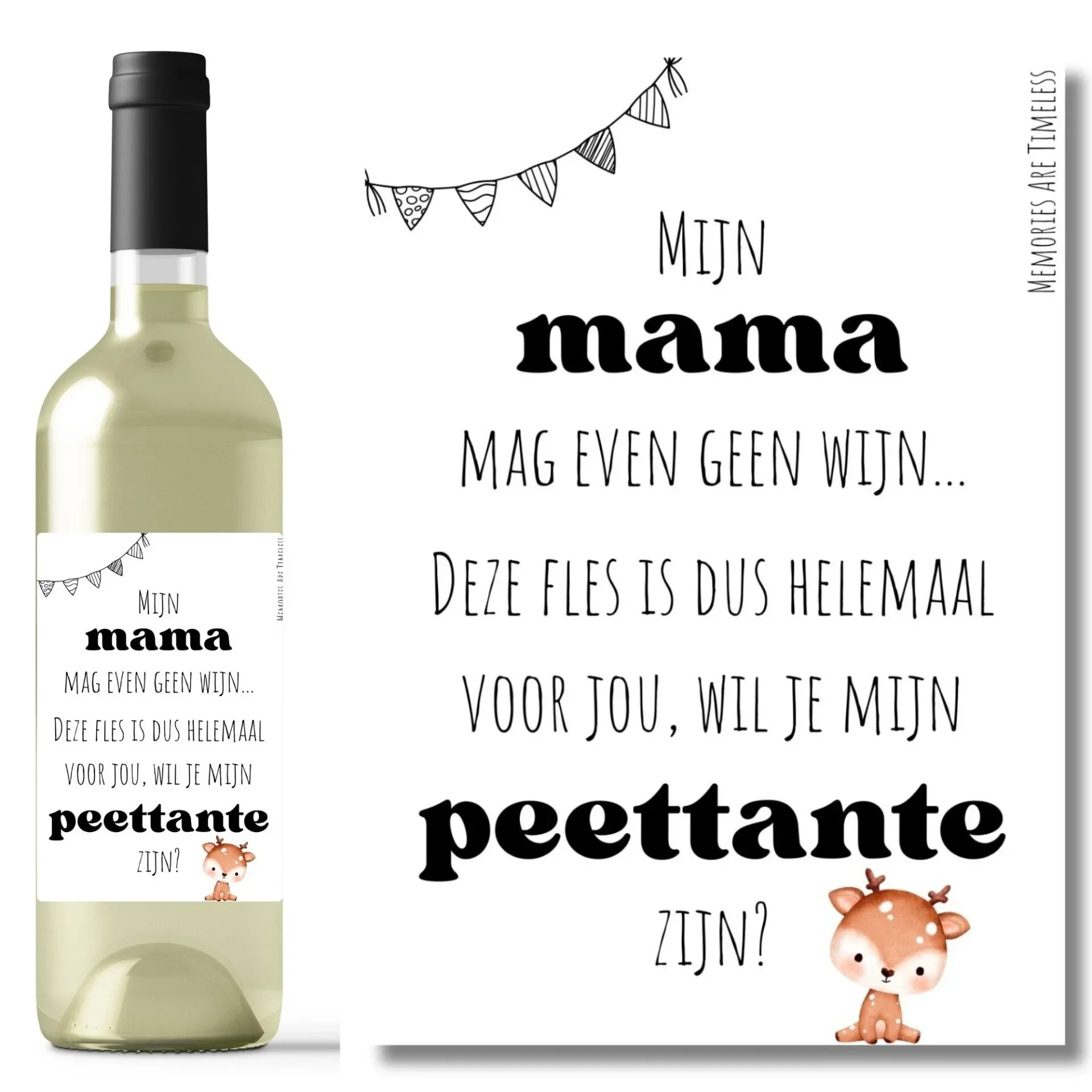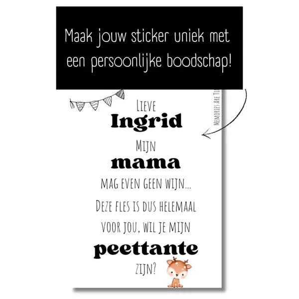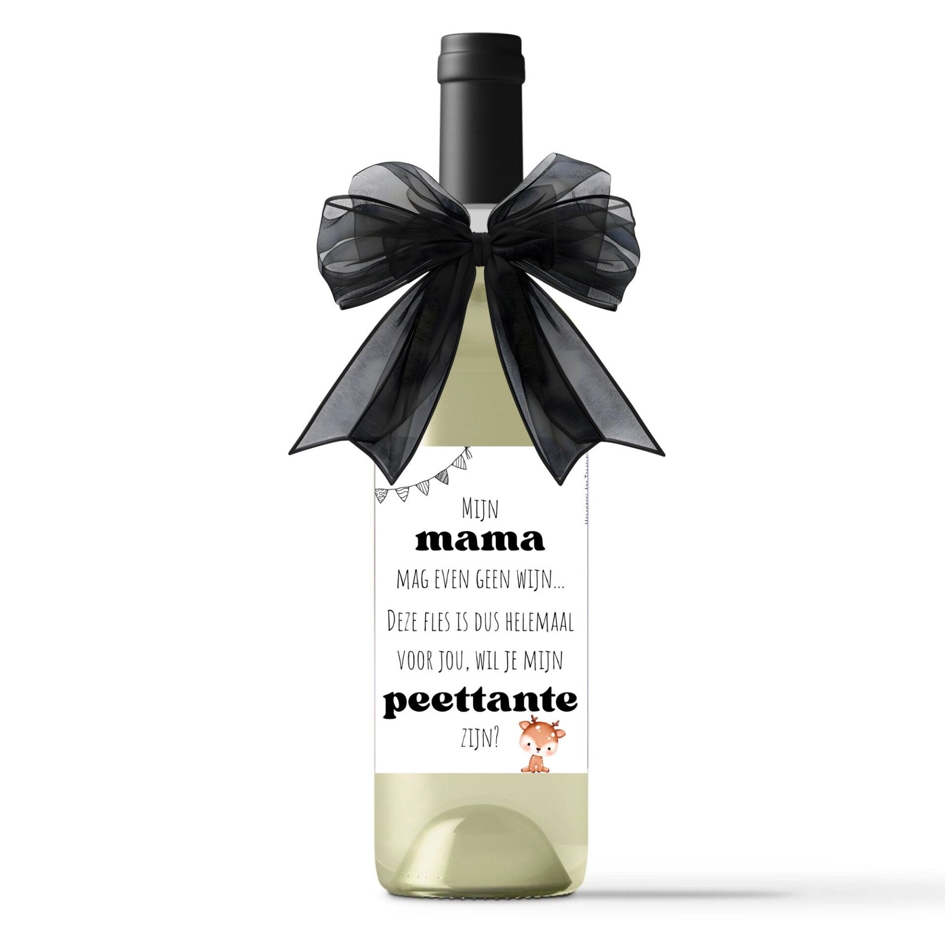 Wil je een bijzondere en stijlvolle manier om jouw toekomstige peettante te verrassen? Dit unieke wijncadeau is een prachtige keuze. De fles wijn is voorzien van een zwart-wit etiket met een lief hertje en de tekst: "Mijn mama mag even geen wijn... deze fles is dus helemaal voor jou. Wil je mijn peettante zijn?"