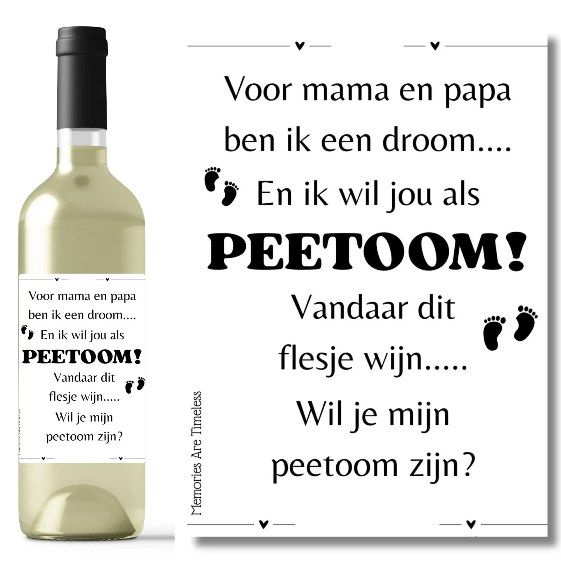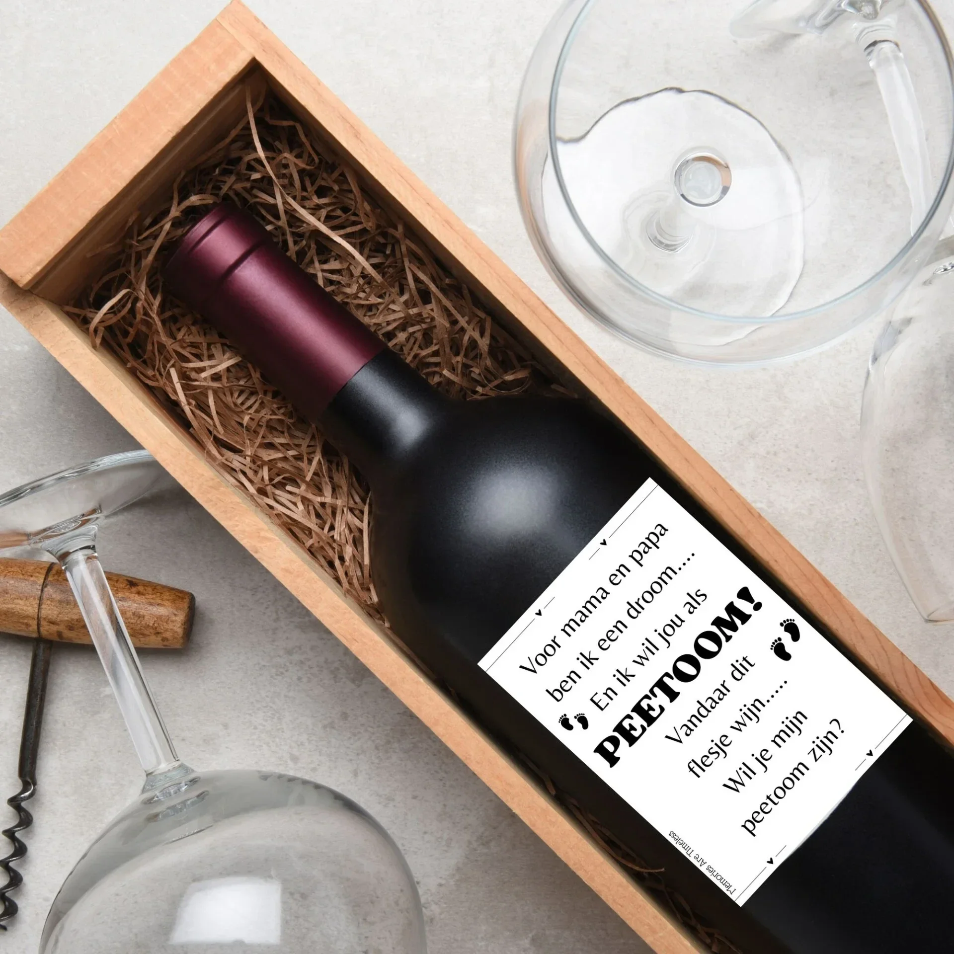 Wil je iemand op een bijzondere manier vragen om peetoom te worden? Dit originele wijncadeau maakt dat moment onvergetelijk. Op de fles zit een stijlvol zwart-wit etiket met babyvoetjes en de tekst: