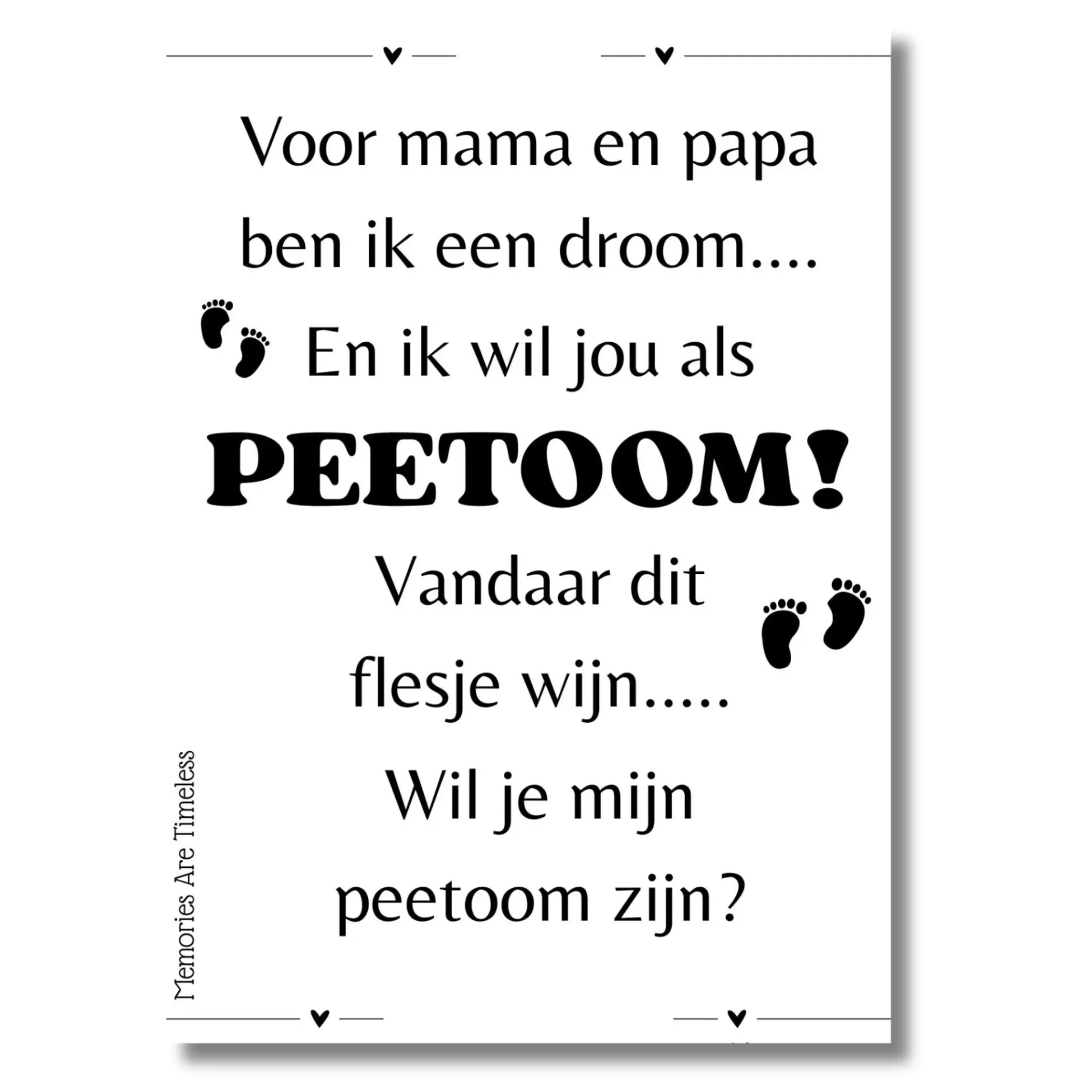 "Voor mama en papa ben ik een droom... En ik wil jou als peetoom. Vandaar dit flesje wijn... wil je mijn peetoom zijn?"