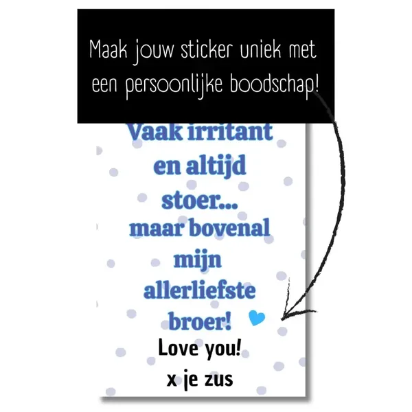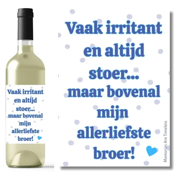 Soms een beetje irritant, meestal stoer maar altijd je allerliefste broer. Met dit originele wijncadeau zeg je precies wat je voelt, met een knipoog én een vleugje liefde. Het etiket op de fles draagt de tekst: "Vaak irritant en altijd stoer, maar bovenal mijn allerliefste broer" – een grappige en toch oprechte boodschap voor een broer die je stiekem niet zou willen missen.