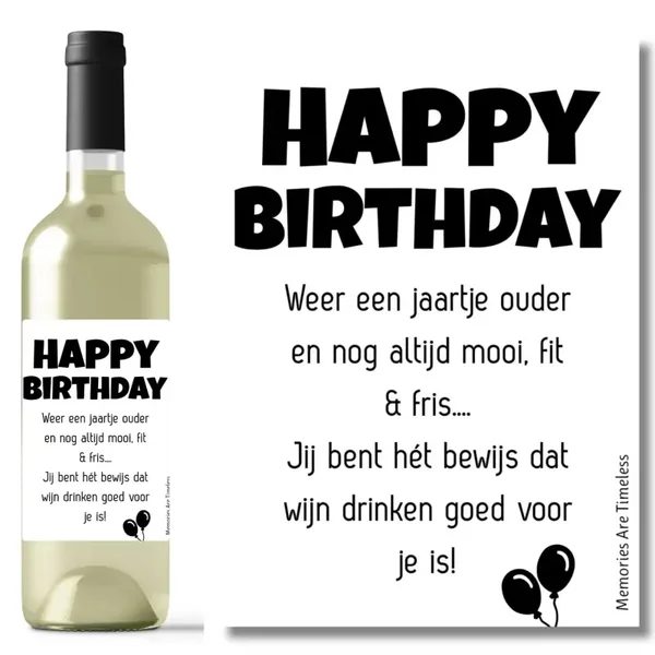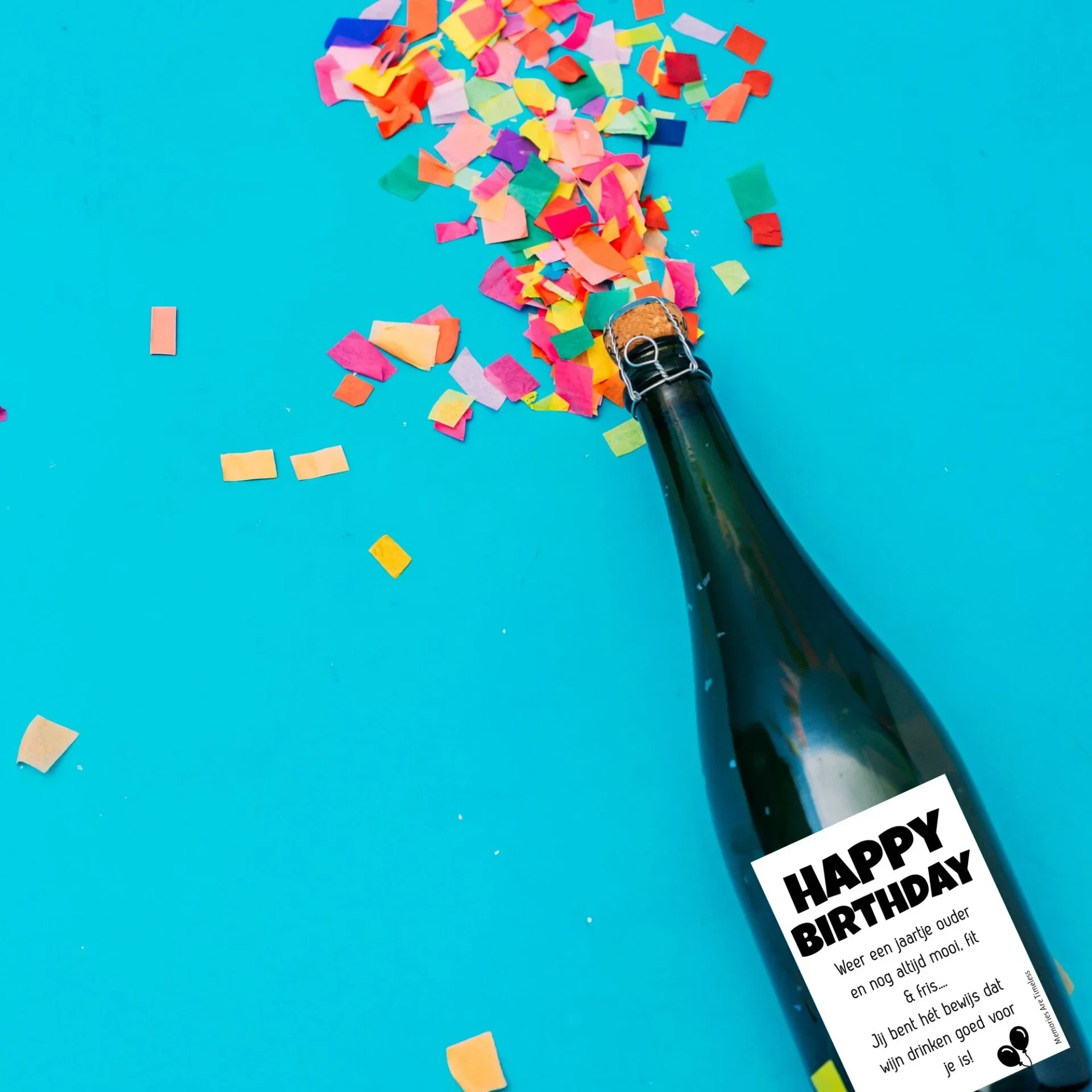 Wil je het helemaal feestelijk maken? Voeg dan een bijpassend kaartje toe met jouw eigen woorden. Zo geef je niet alleen een fles wijn, maar een onvergetelijk verjaardagscadeau met een vrolijke en persoonlijke touch.