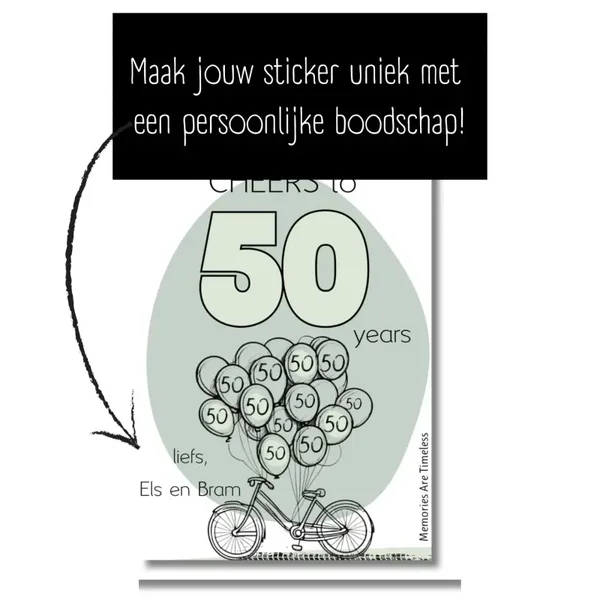 Met dit stijlvolle wijncadeau verras je de jarige met een uniek en feestelijk geschenk. De fles is voorzien van een etiket met de tekst "Cheers to 50 years" in zachte groene tinten, met vrolijke ballonnen die aan een fiets vastzitten. Superleuk voor Sarah, Abraham of wie dan ook 50 wordt.
