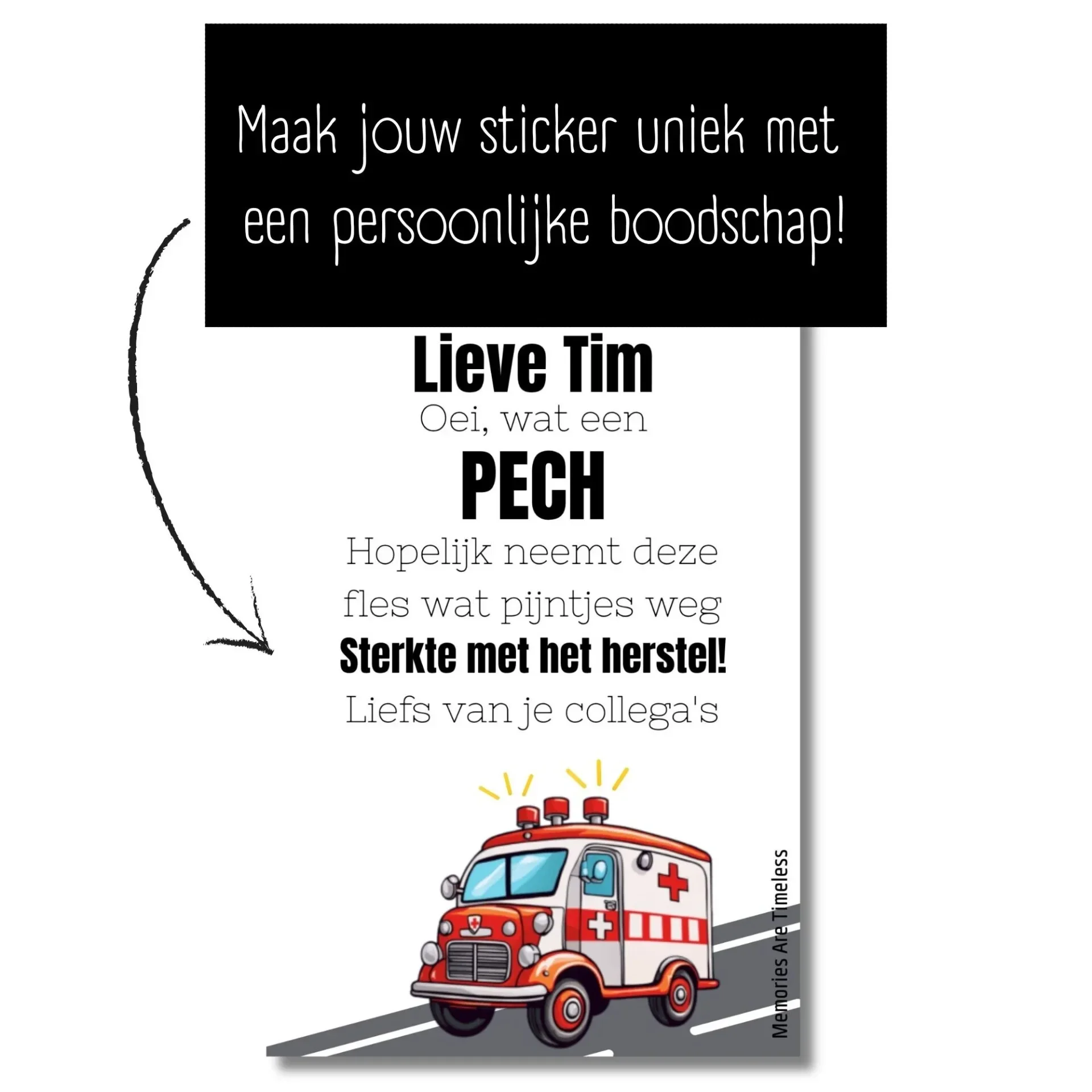 Soms zegt een kleine verrassing meer dan duizend woorden. Dit luchtige wijncadeau is perfect voor iemand die pech heeft gehad, ziek is of wel wat opkikkers kan gebruiken. Op de fles zit een vrolijk etiket met een ambulance en de tekst: