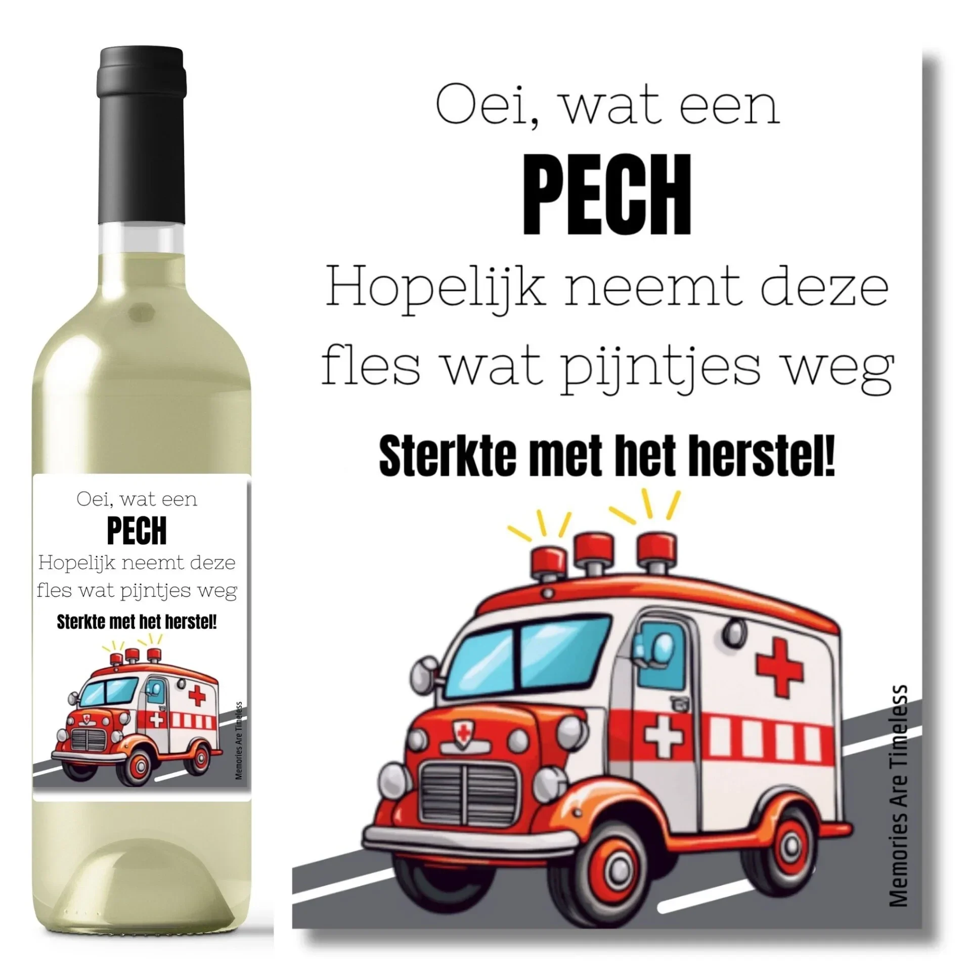 "Oei, wat een pech. Hopelijk neemt deze fles wijn wat pijntjes weg. Sterkte met het herstel!"