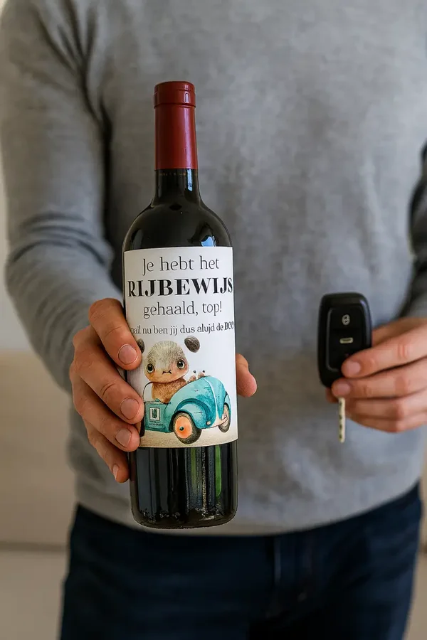 Op zoek naar een grappig cadeau voor iemand die net zijn of haar rijbewijs heeft gehaald? Dit vrolijke wijncadeau is de perfecte verrassing. Op de fles zit een etiket met een grappig beestje in een auto en de tekst: