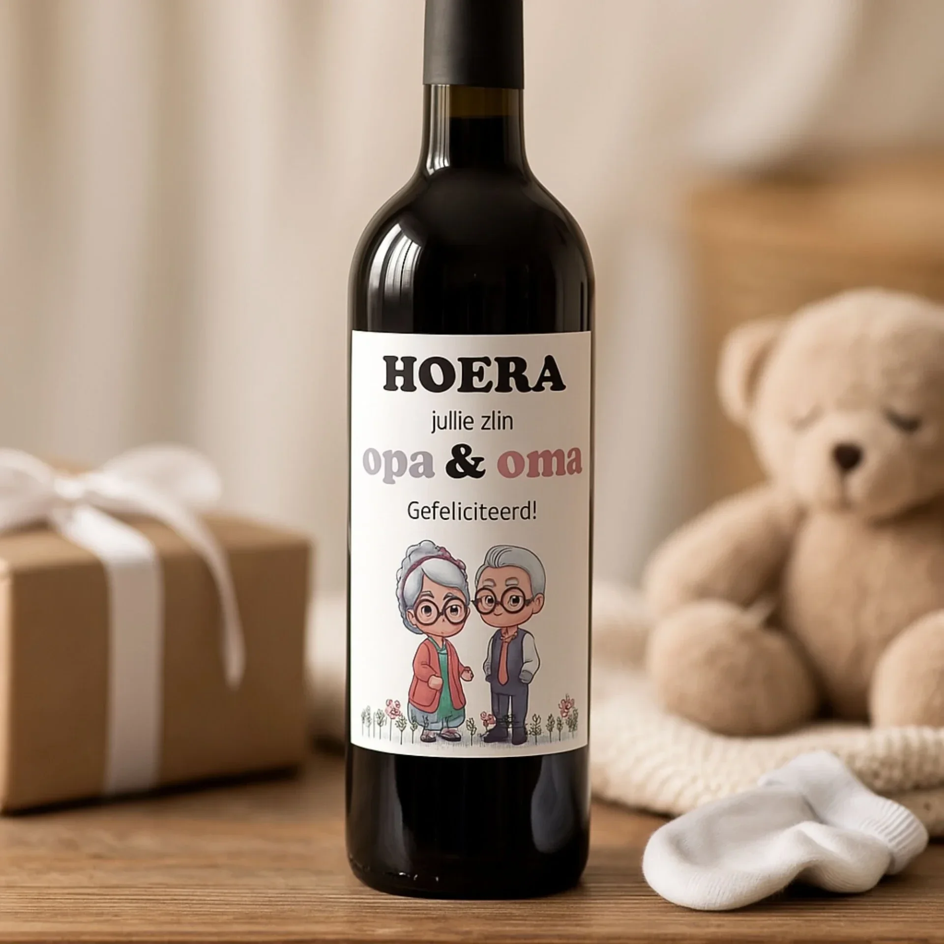 Op de fles zit een vrolijk etiket met een lieve illustratie en de tekst: "Hoera, jullie zijn opa & oma – Gefeliciteerd!" Een bijzonder gebaar om dit mooie moment te vieren en een blijvende herinnering te creëren.