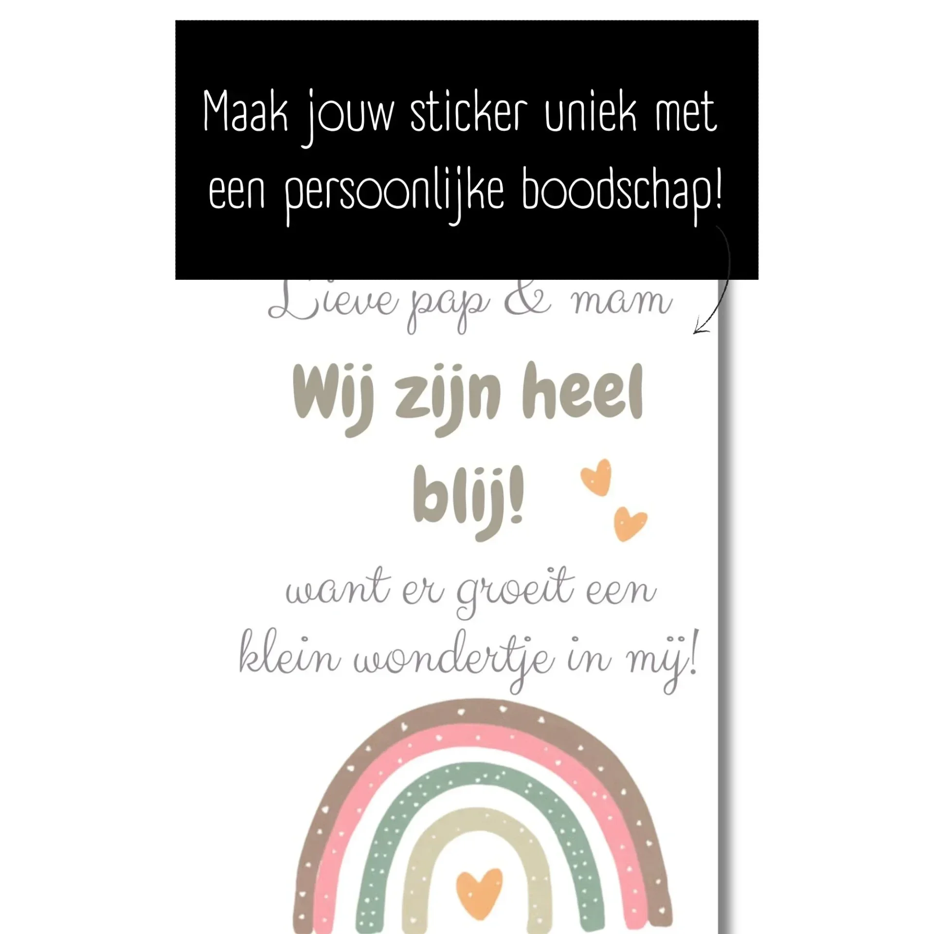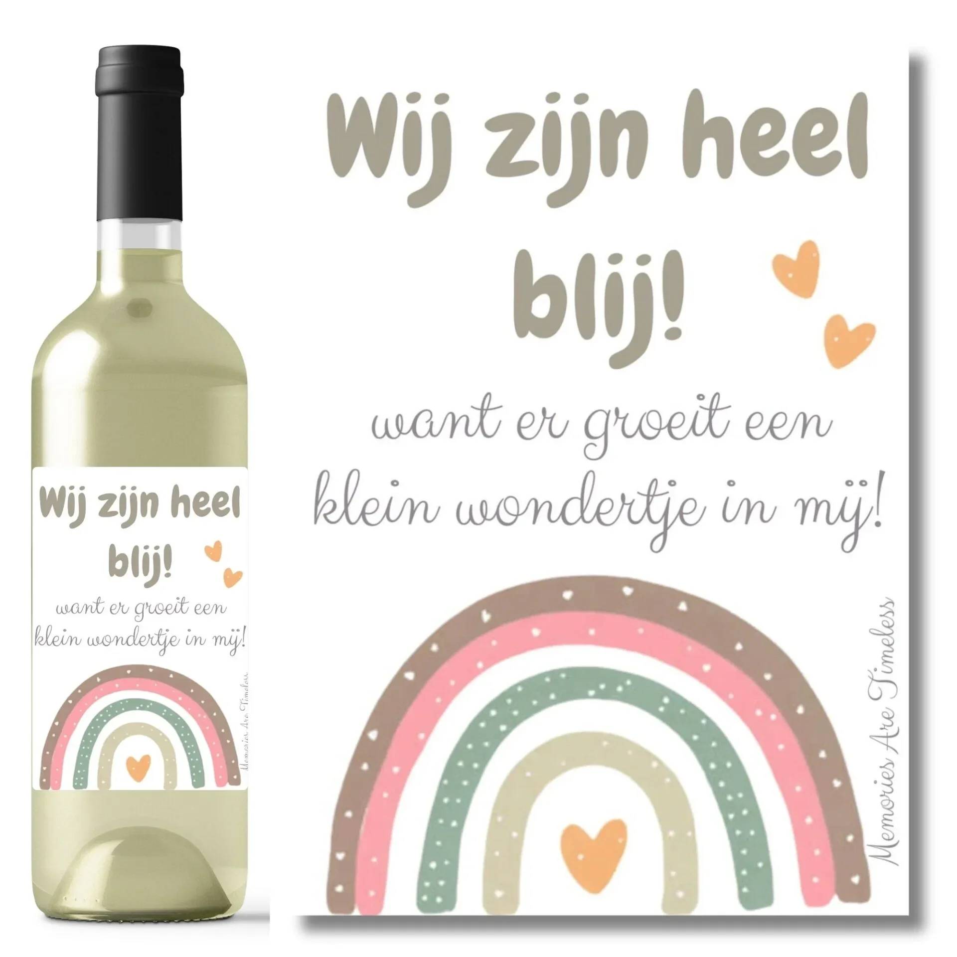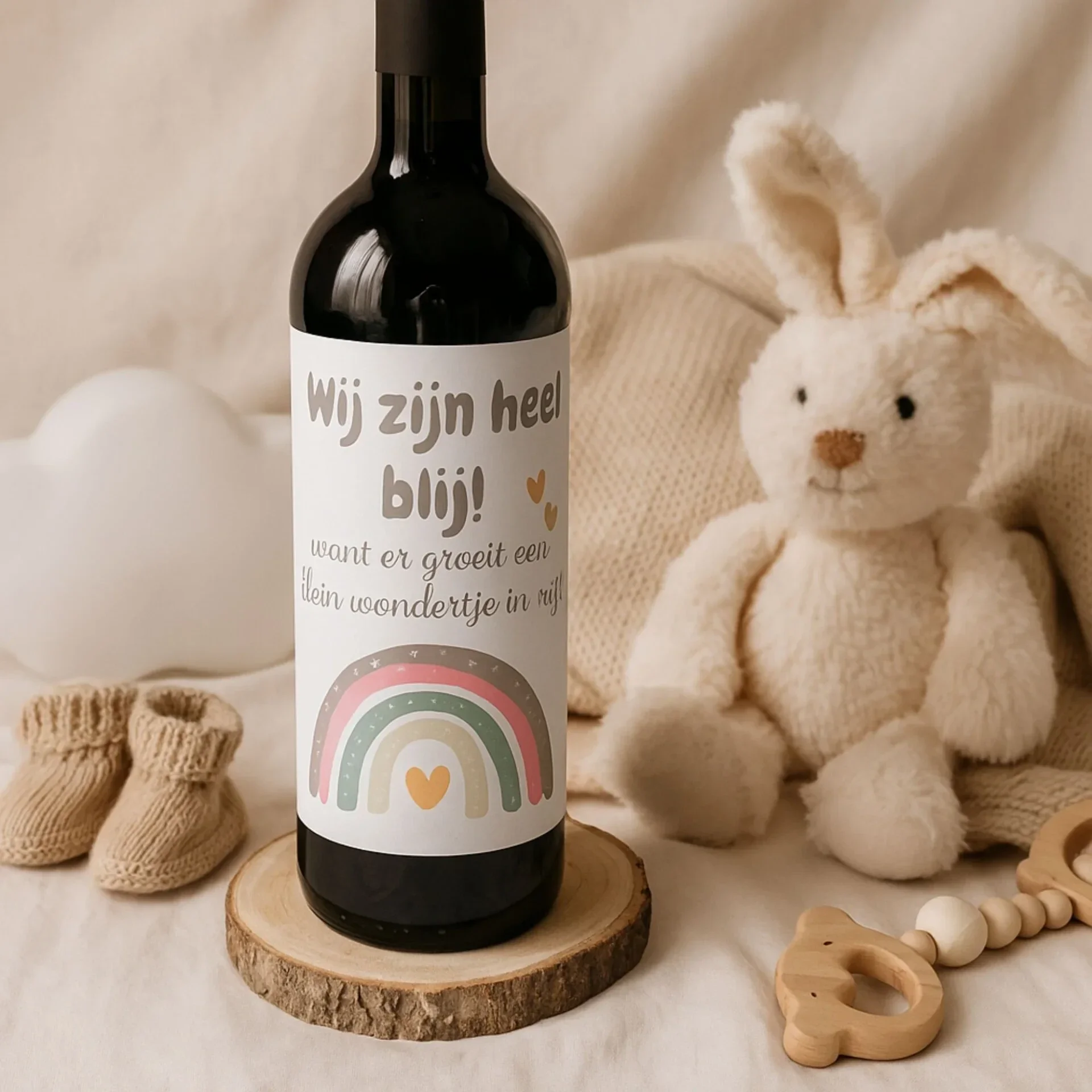De fles is voorzien van een stijlvol etiket in zachte pastelkleuren met een regenboog en de liefdevolle tekst: "Wij zijn heel blij! Want er groeit een klein wondertje in mij!" Zo verander je een fles wijn in een unieke en onvergetelijke aankondiging van jullie zwangerschap.