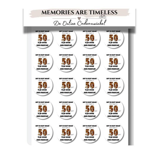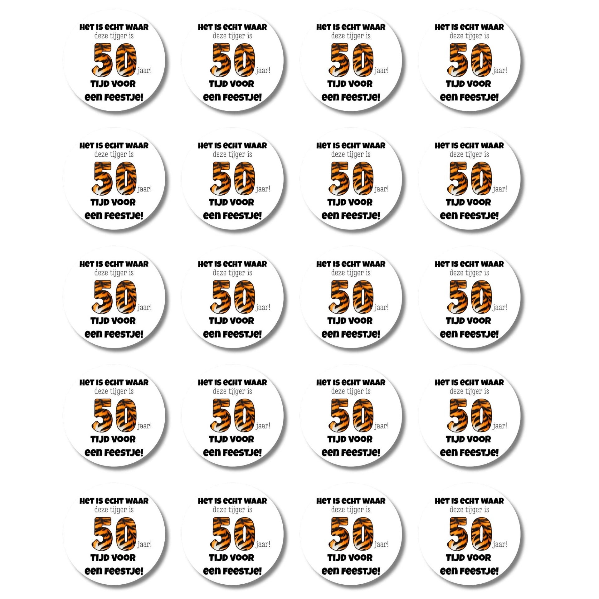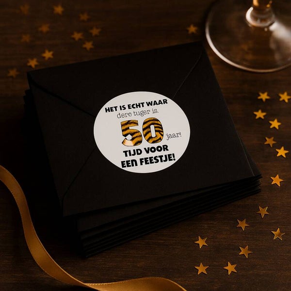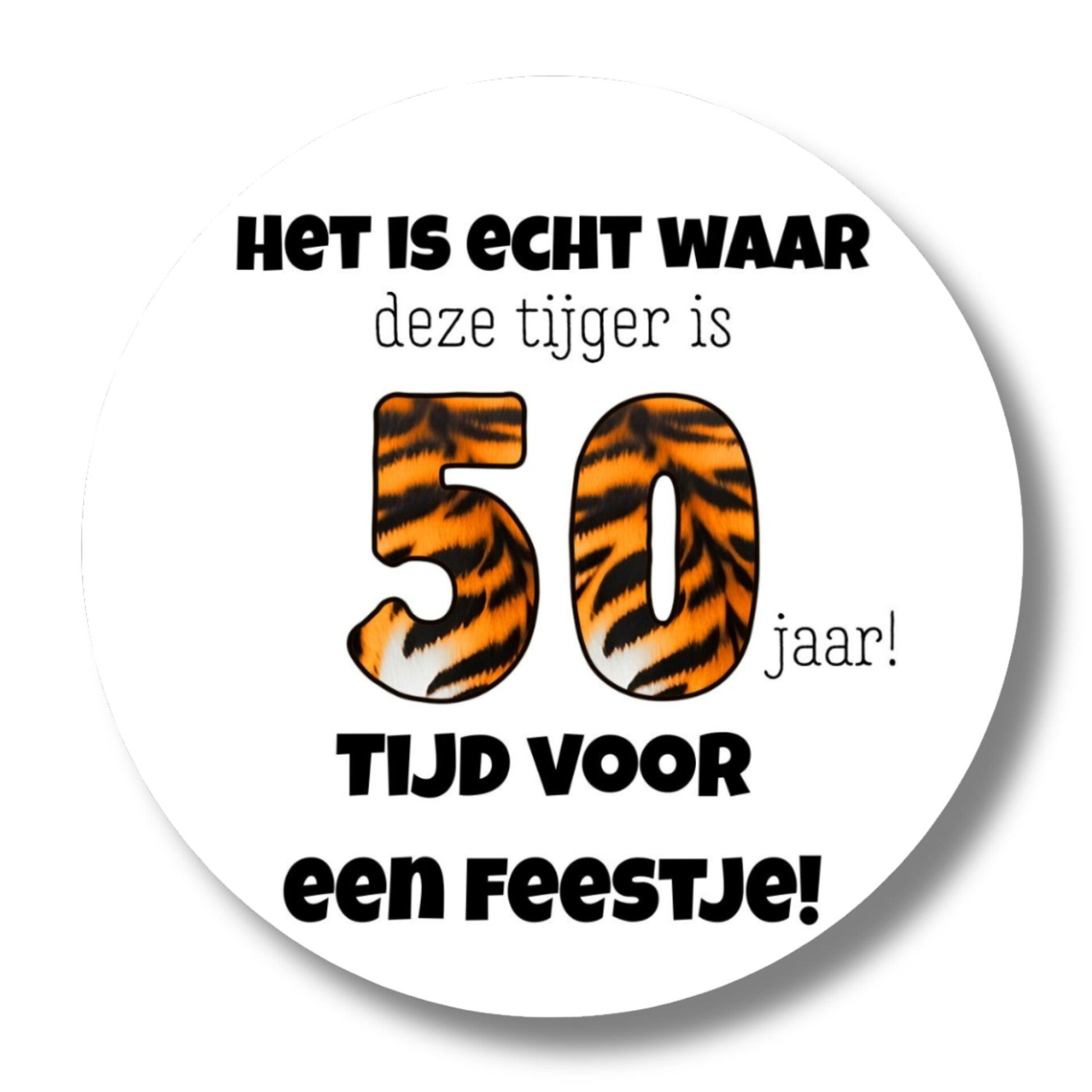 Maak de 50e verjaardag extra feestelijk met deze stoere ronde stickers van 4 cm met tijgerprint. De tekst “Het is echt waar, deze tijger is 50 jaar! Tijd voor een feestje!” maakt deze stickers perfect voor een Sarah of Abraham feest.