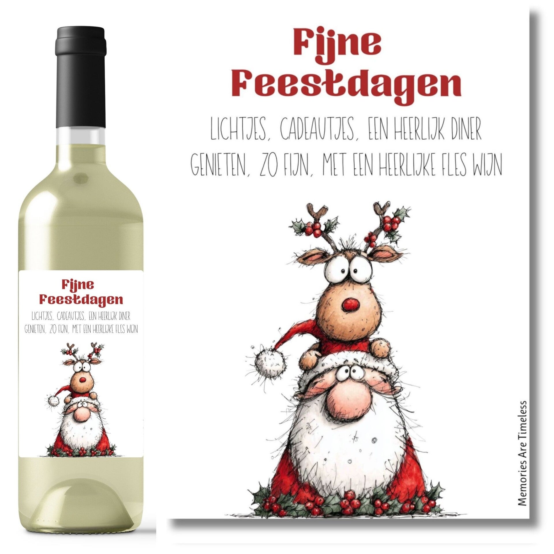 Met de grappige illustratie van de kerstman en het rendier, én de feestelijke tekst “lichtjes, cadeautjes, een heerlijk diner, genieten, zo fijn, met een heerlijke fles wijn”, maak je van elke fles een blikvanger. Een perfect geschenk voor vrienden, familie, collega’s of relaties tijdens de feestdagen.