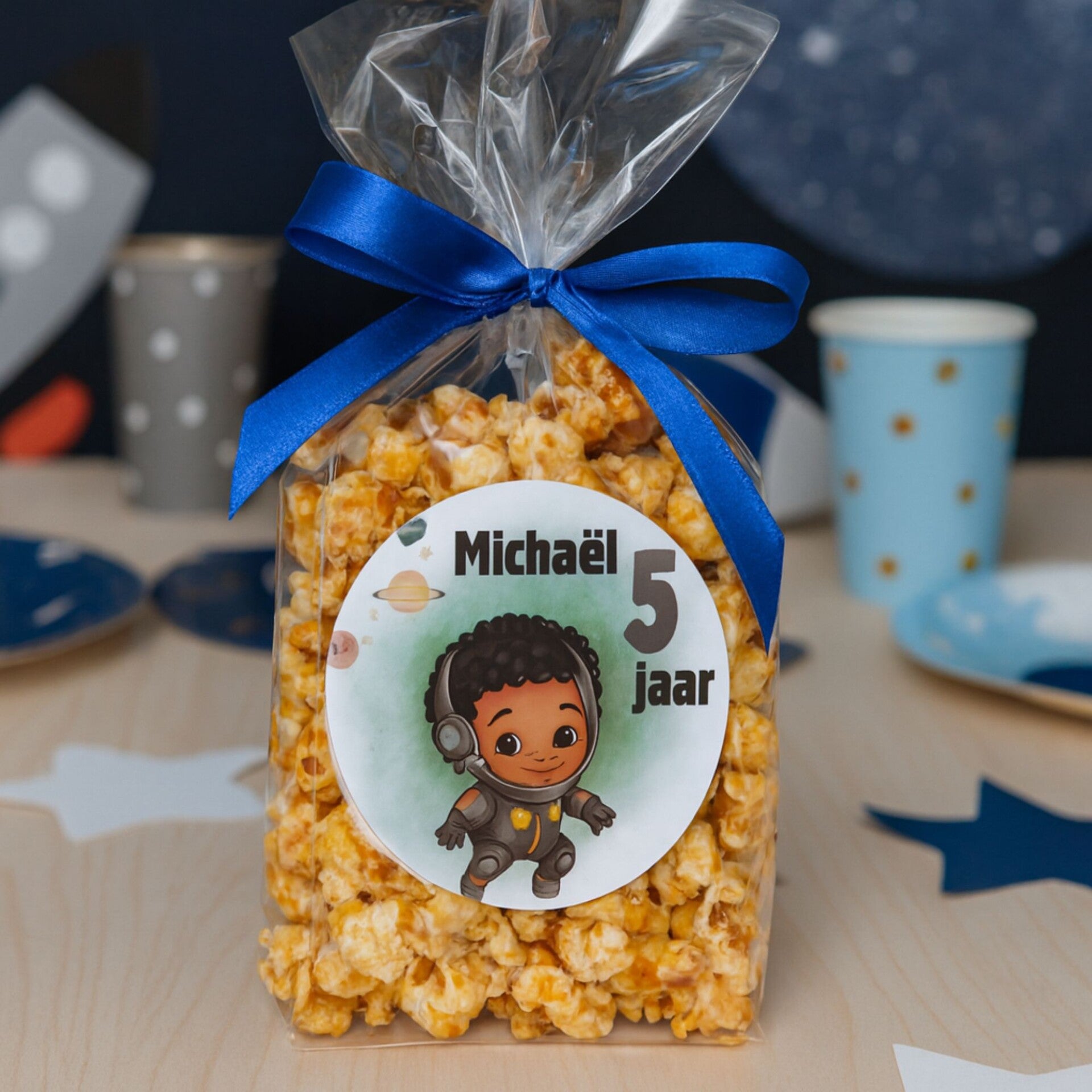 Laat traktaties stralen met deze gepersonaliseerde verjaardagstickers in ruimte thema! Elke sticker wordt bedrukt met naam en leeftijd van je kind en heeft een vrolijk ontwerp met een jongen met zwarte krulletjes in astronautenpak, omringd door UFO’s, planeten en sterren.