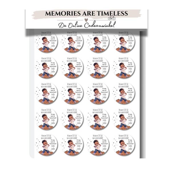 De stickers hebben een stoer ontwerp met een jongetje met vrolijke haren en een ketting. Perfect om te gebruiken op traktaties, zakjes of kleine cadeautjes voor vriendjes, vriendinnetjes en begeleiders.