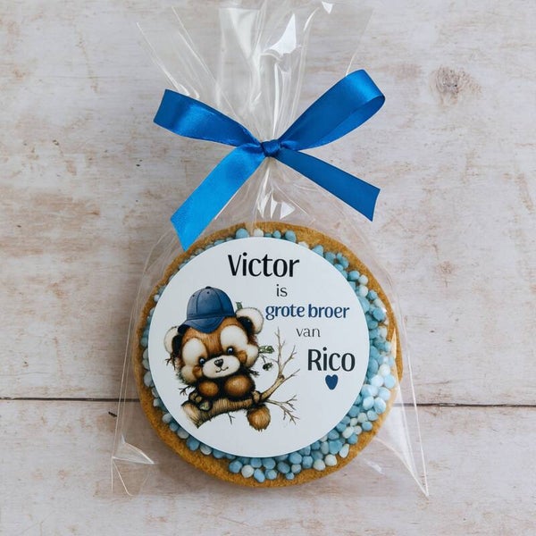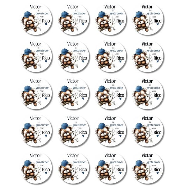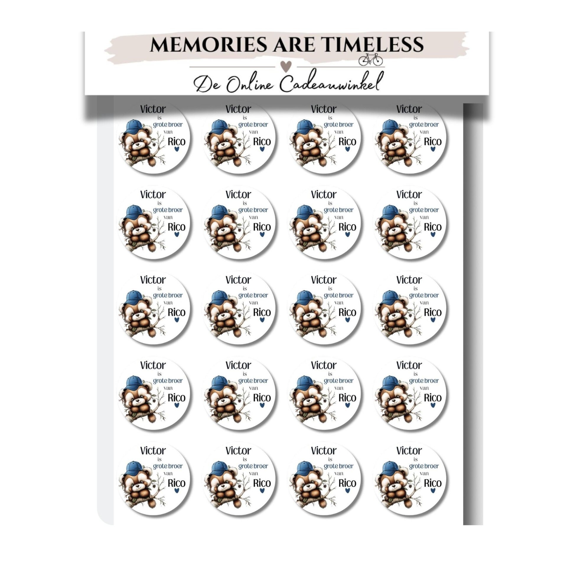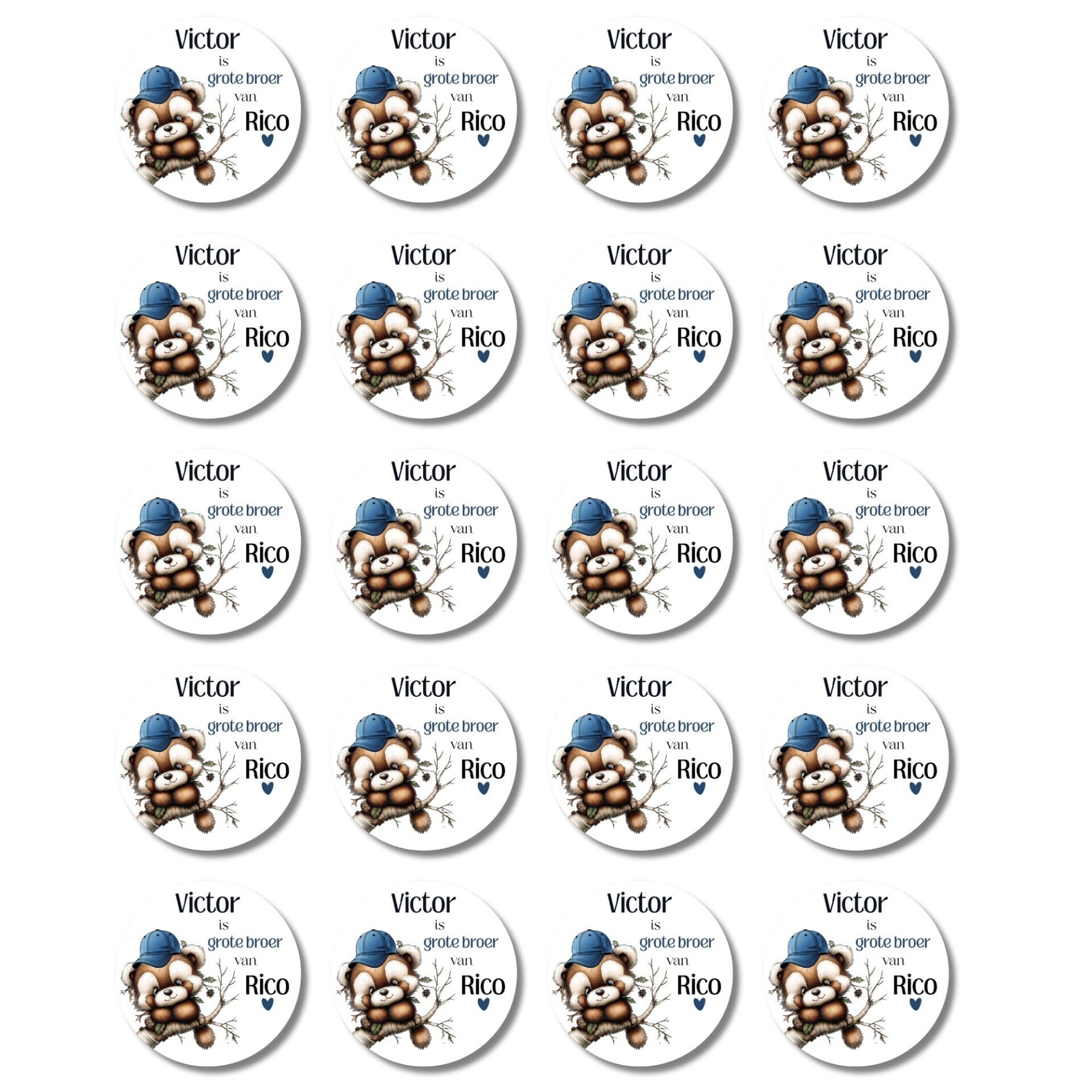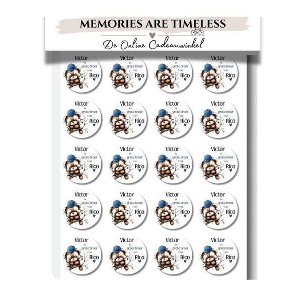 Vier de geboorte van een broertje of zusje op een originele manier met deze gepersonaliseerde grote broer stickers! Elke sticker bevat de tekst: "(Naam) is grote broer van (Naam)". Het schattige ontwerp met een beertje met blauw petje op een tak maakt de stickers extra bijzonder.