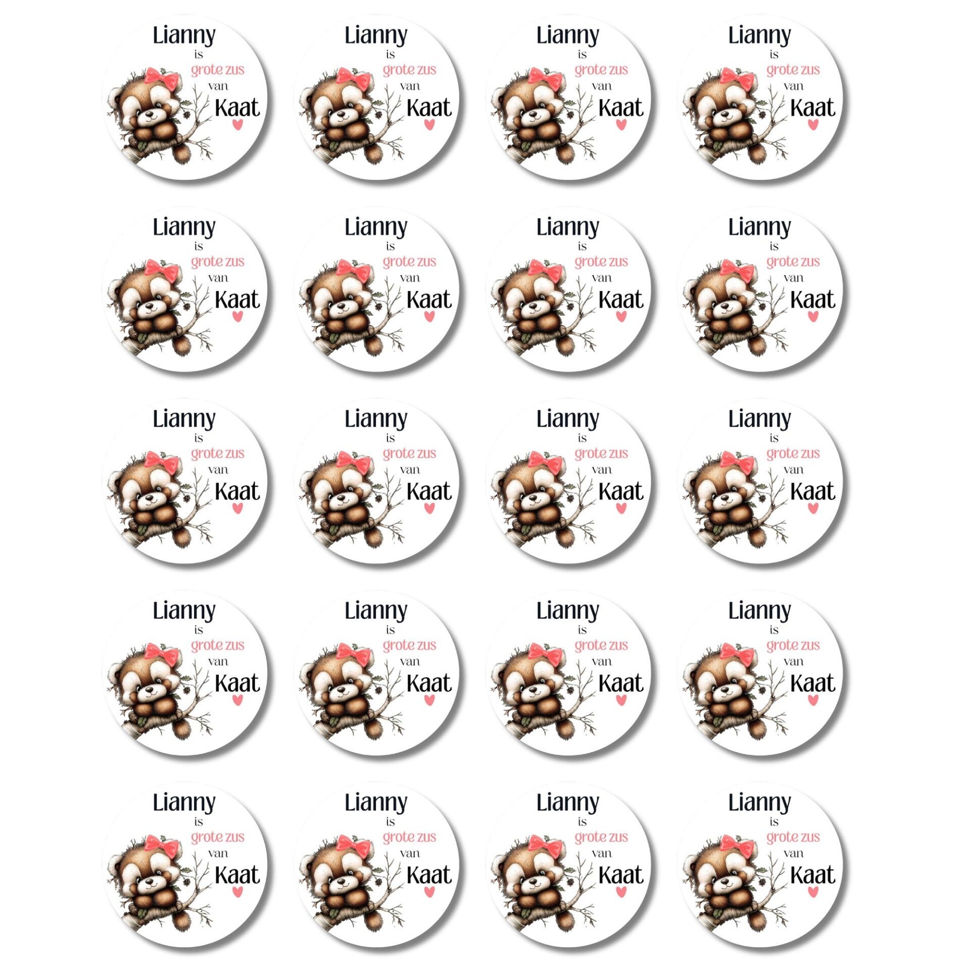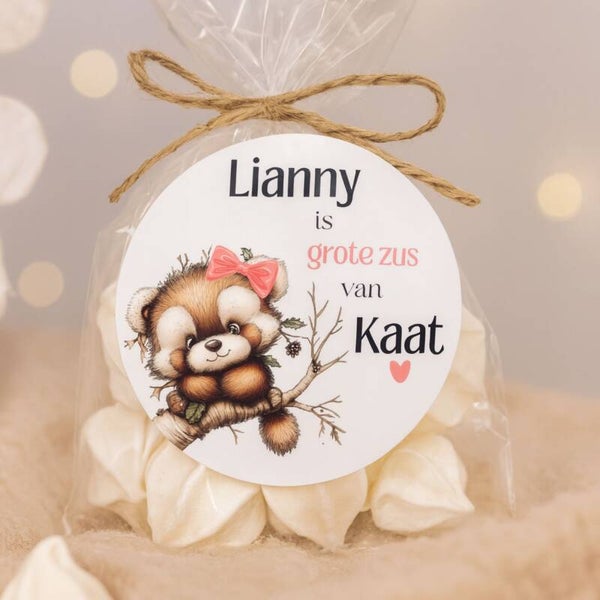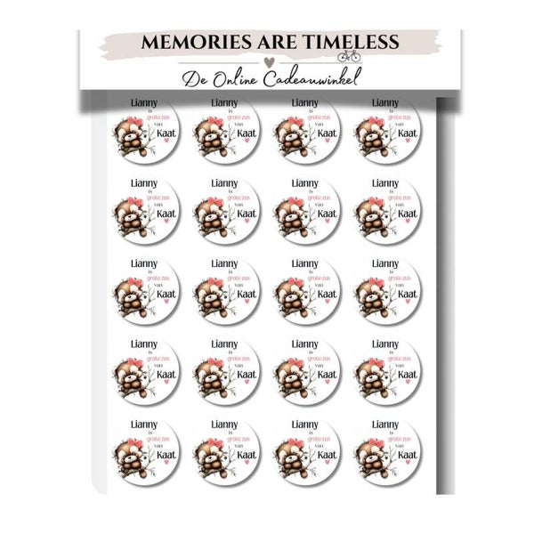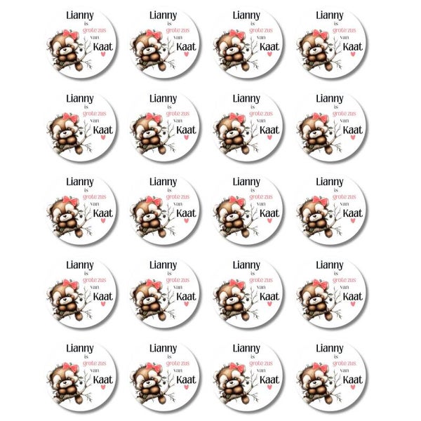 Maak de geboorte van een zusje extra feestelijk met deze gepersonaliseerde grote zus stickers! Elke sticker bevat de tekst: "(Naam) is grote zus van (Naam)" en heeft een lief ontwerp met een beertje met roze strik op een tak.