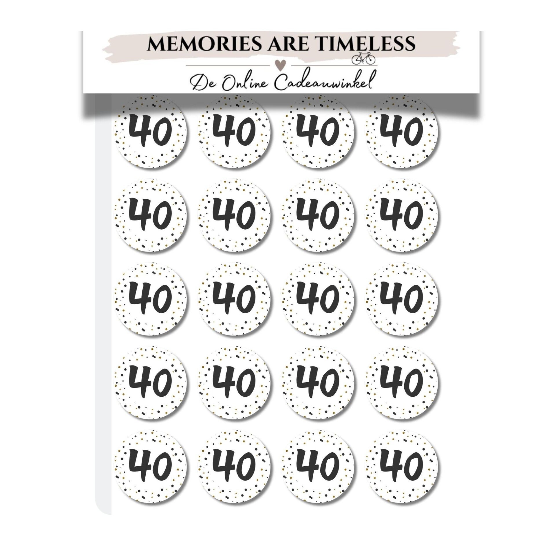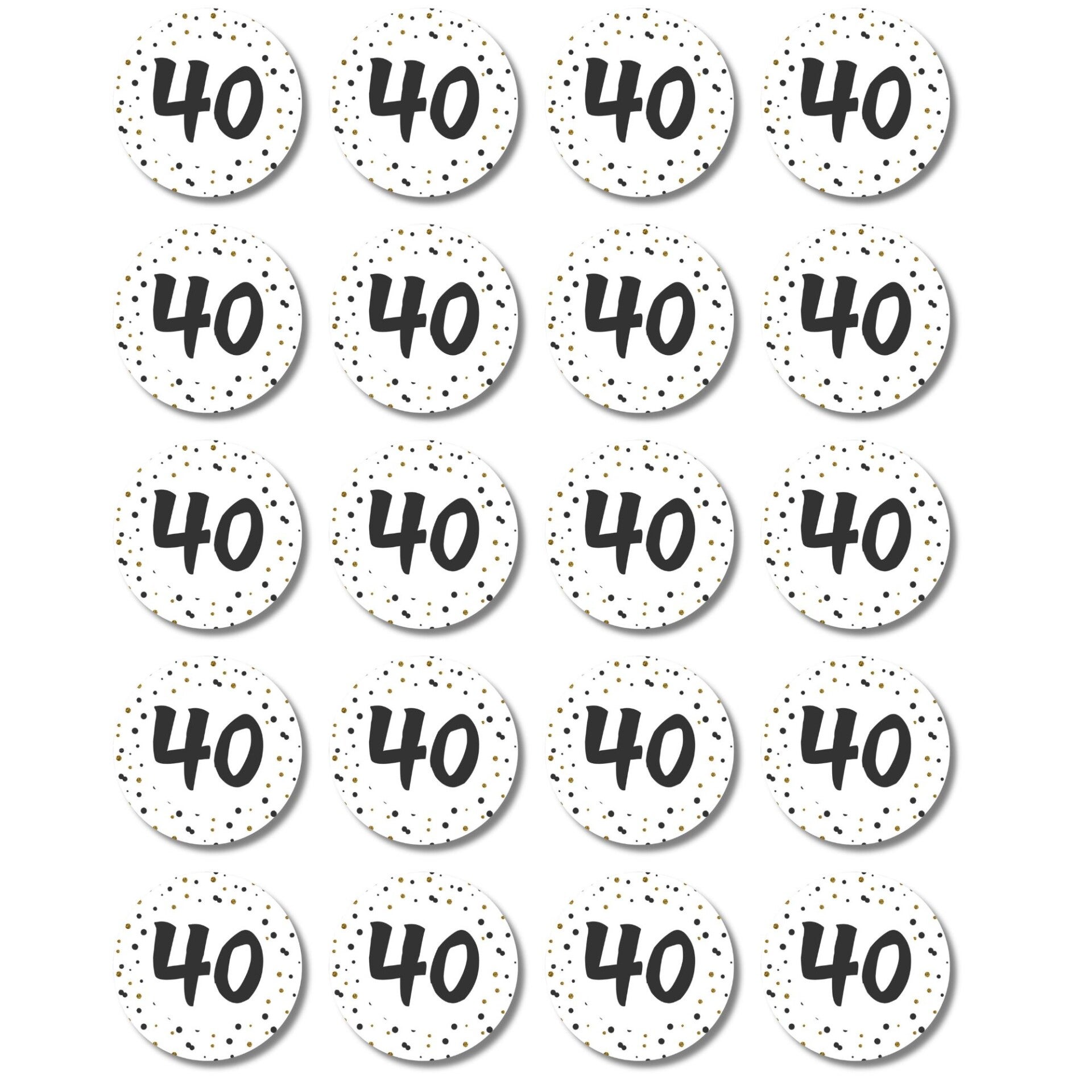 Maak een 40e verjaardag of jubileum extra feestelijk met deze stijlvolle stickers. De stickers zijn wit met een vrolijk patroon van zwarte en gouden stippen en het cijfer 40 groot in het midden.