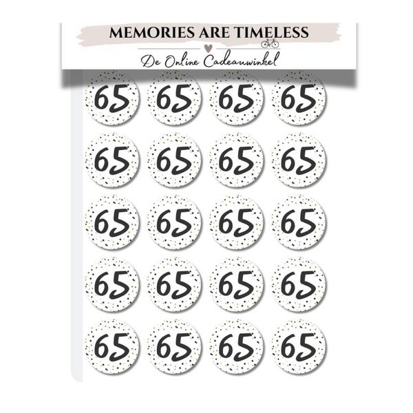 Maak een 65e verjaardag of jubileum extra feestelijk met deze stijlvolle stickers. De ronde stickers zijn wit met een luxe patroon van gouden en zwarte stippen en het cijfer 65 groot in het midden.